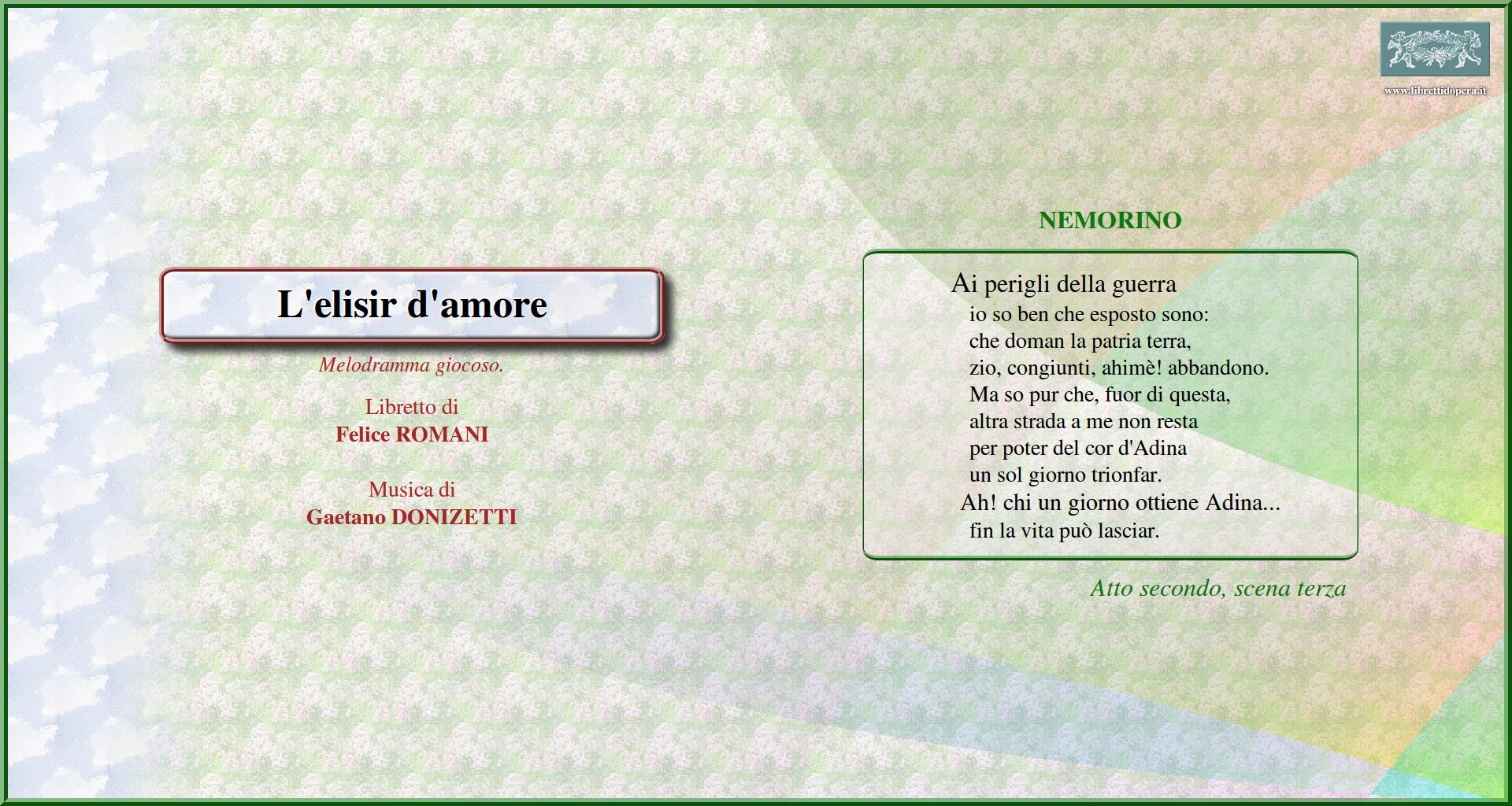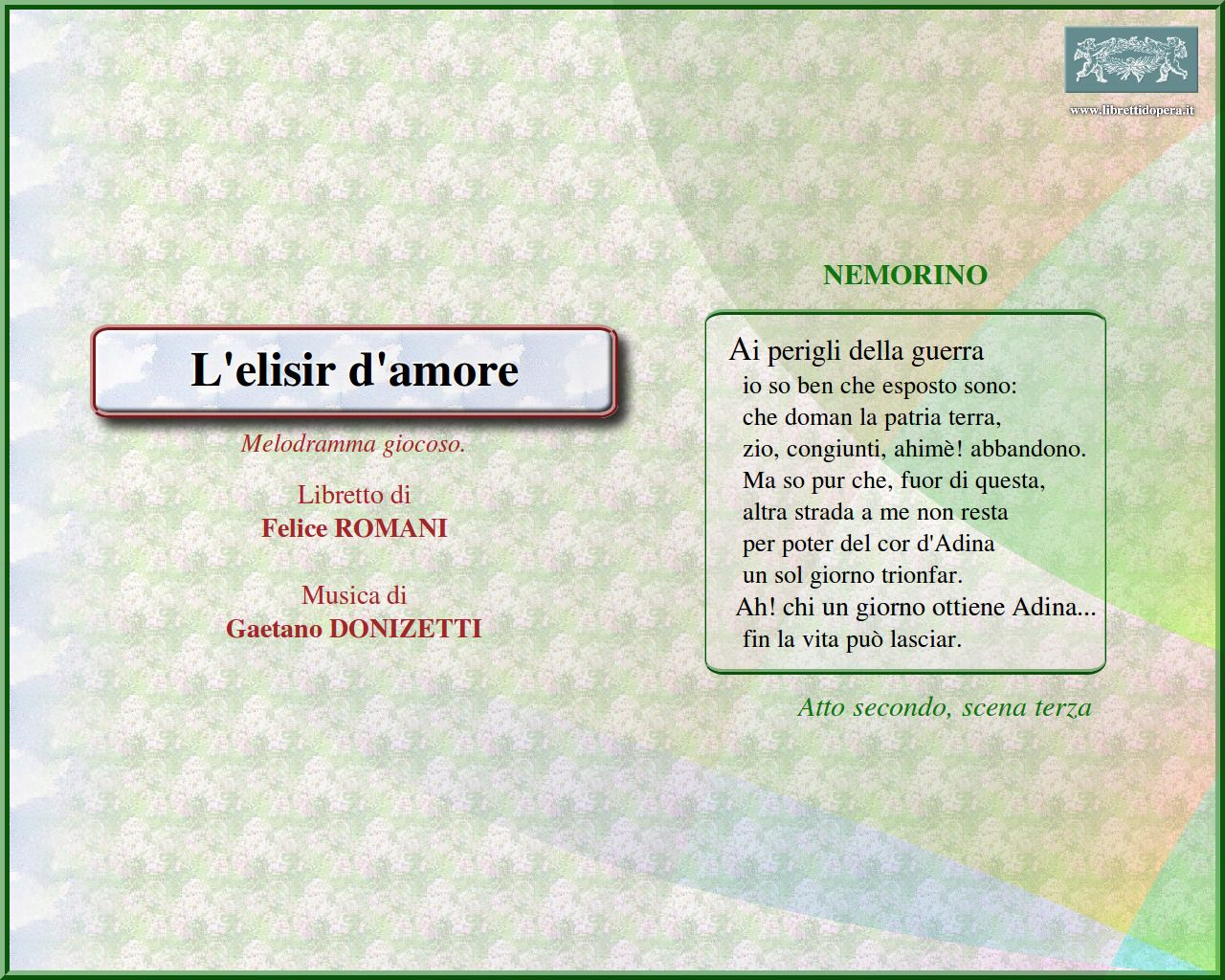 Quanto è bella, quanto è cara! Come Paride vezzoso Chiedi al rio perché gemente Benefattor degli uomini Cantiamo ancora un brindisi Ai perigli della guerra Una tenera occhiatina Una furtiva lagrima