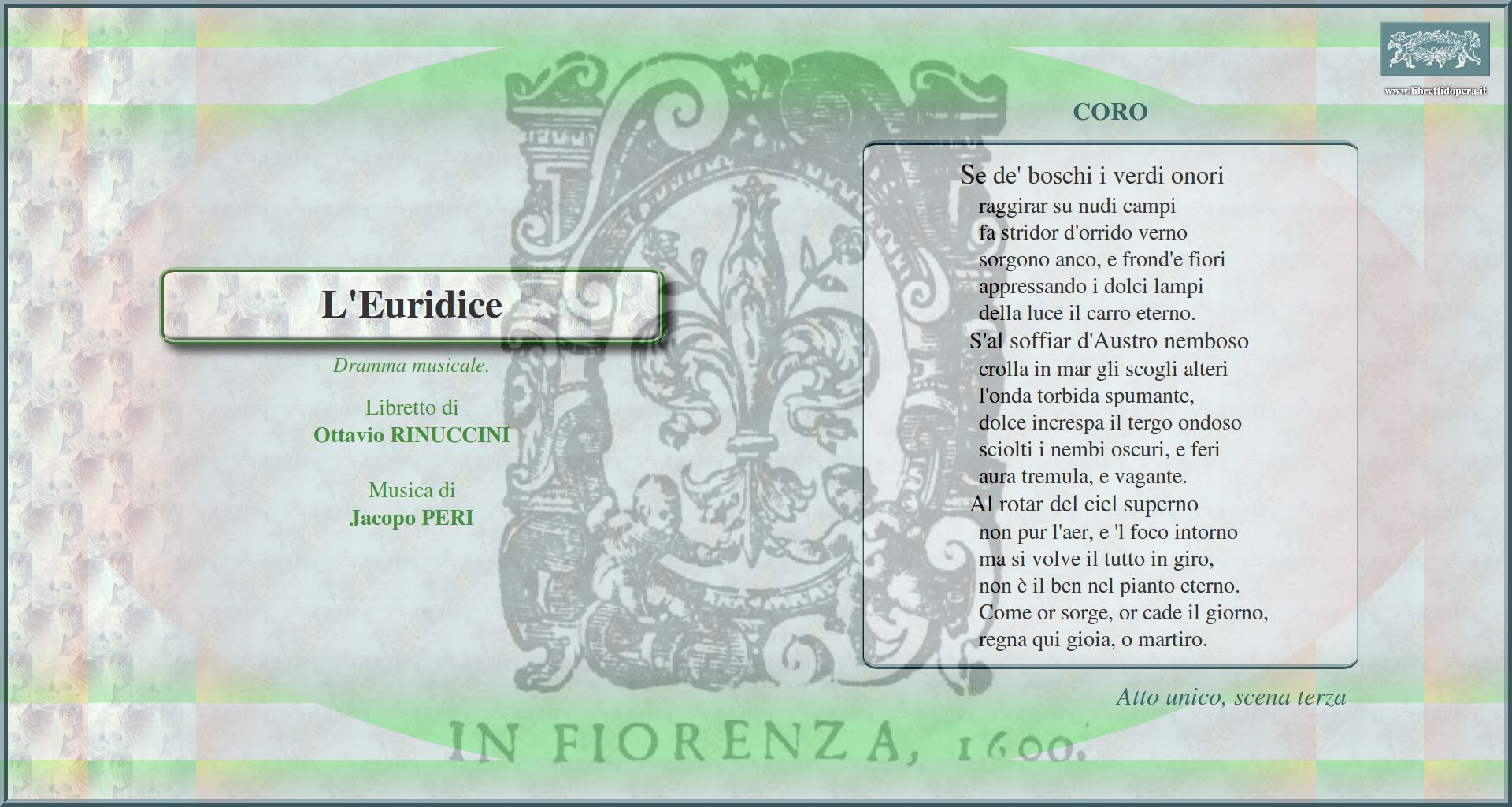 Al canto, al ballo, all'ombre, al prato adorno Nel puro ardor della più bella stella Se de' boschi i verdi onori Funeste piagge ombrosi orridi campi Gioite al canto mio selve frondose