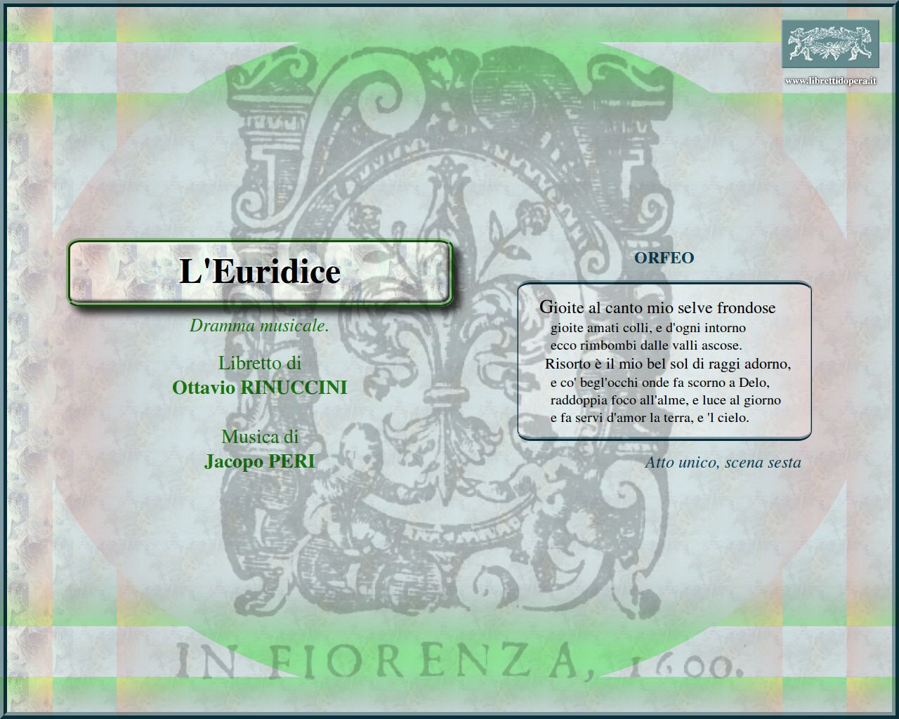 Al canto, al ballo, all'ombre, al prato adorno Nel puro ardor della più bella stella Se de' boschi i verdi onori Funeste piagge ombrosi orridi campi Gioite al canto mio selve frondose