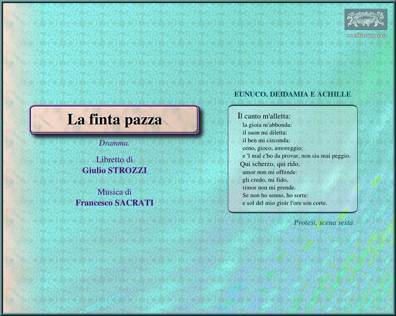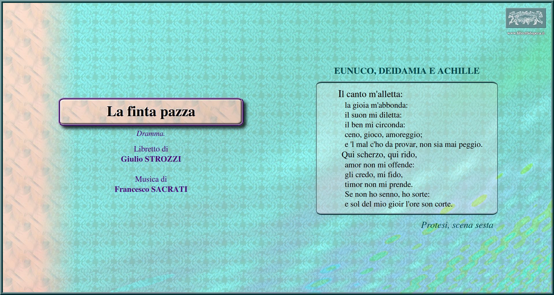 Io non ho benda, o face Il canto m'alletta Verga tiranna ignobile Nella musica del mondo Che melodie son queste?