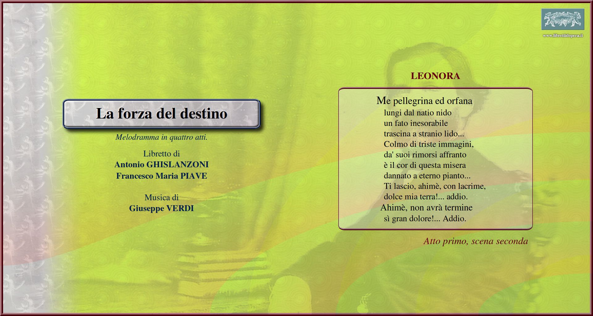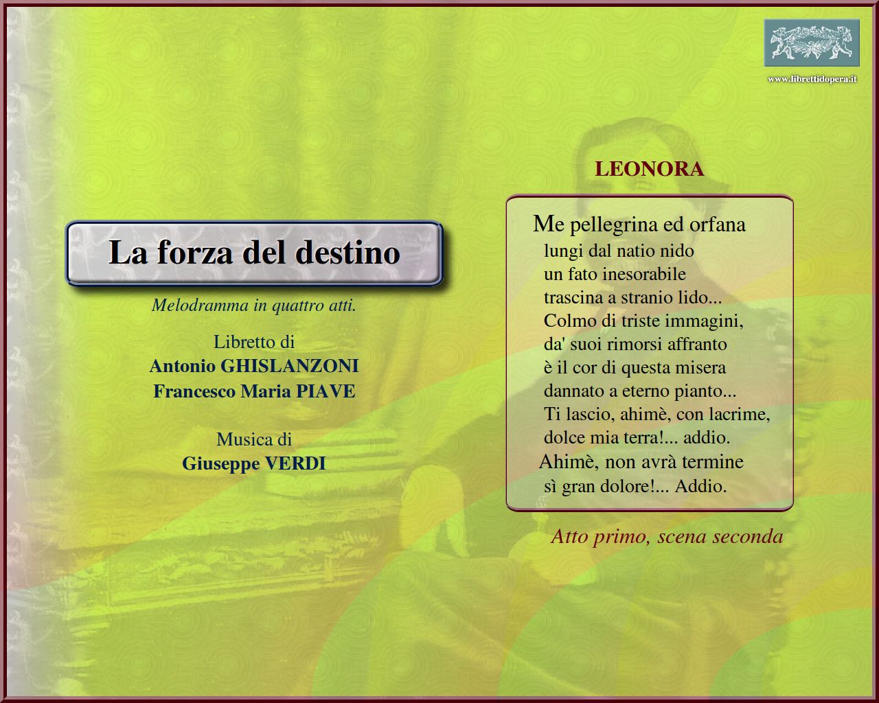 Me pellegrina ed orfana Al suon del tamburo Son Pereda, son ricco d'onore Madre, pietosa vergine O tu che in seno agli angeli Egli è salvo!... Gioia immensa Urna fatale del mio destino Rataplan, rataplan della gloria Pace, pace, mio dio, cruda sventura
