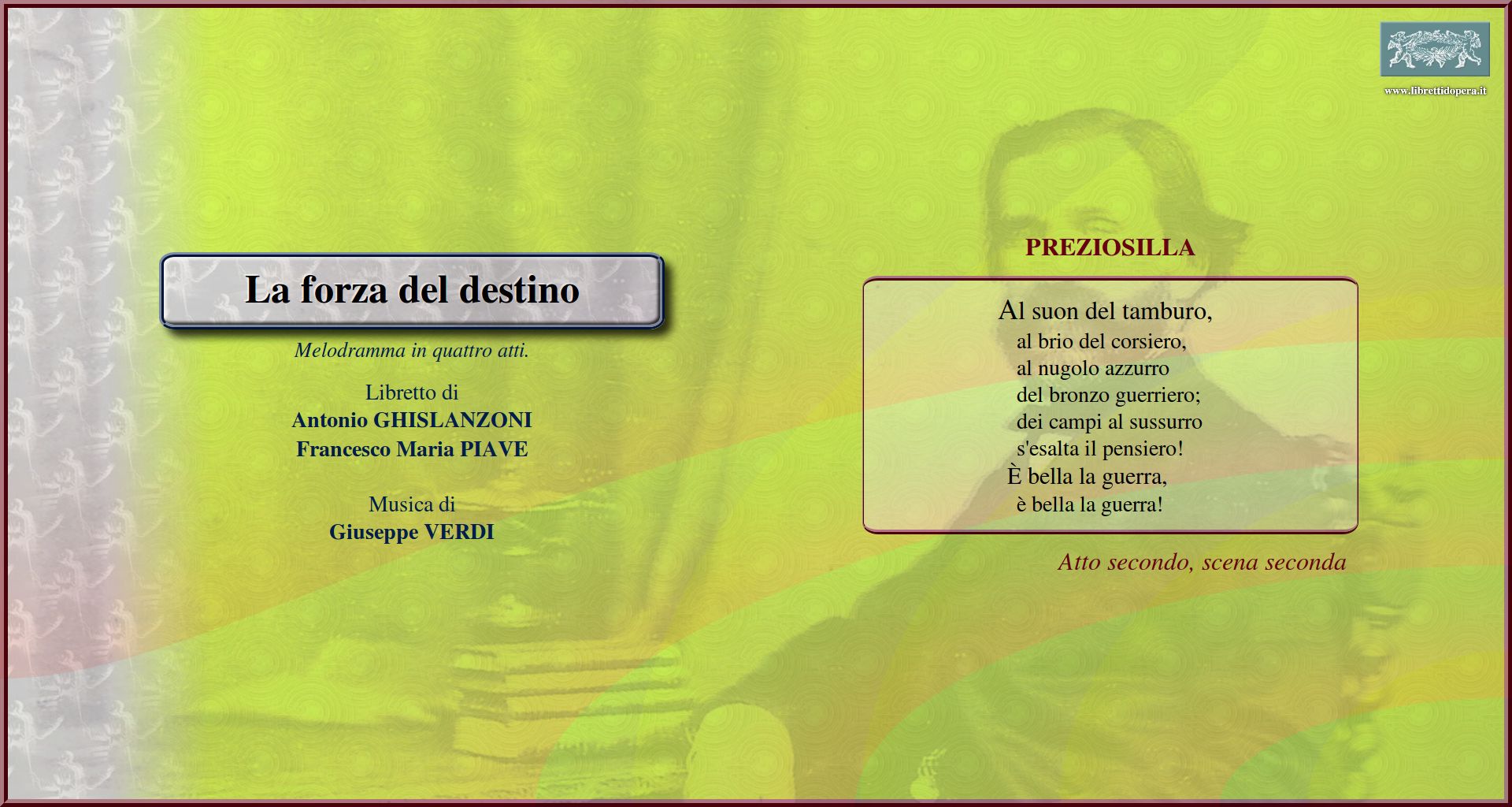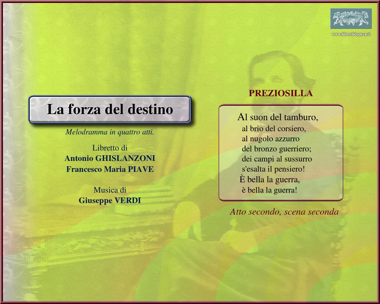 Me pellegrina ed orfana Al suon del tamburo Son Pereda, son ricco d'onore Madre, pietosa vergine O tu che in seno agli angeli Egli è salvo!... Gioia immensa Urna fatale del mio destino Rataplan, rataplan della gloria Pace, pace, mio dio, cruda sventura