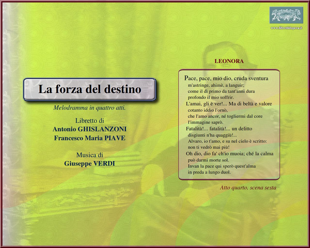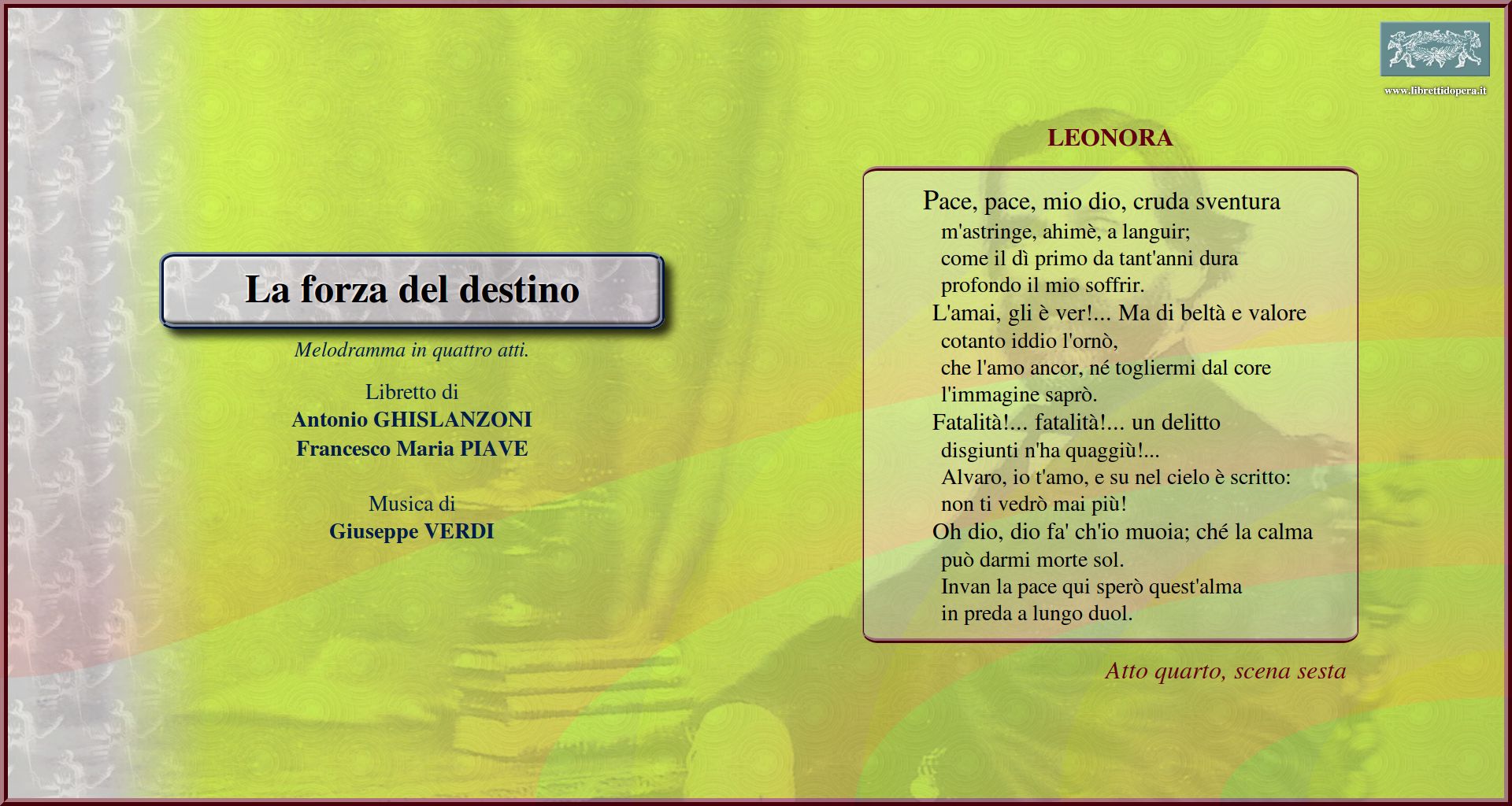 Me pellegrina ed orfana Al suon del tamburo Son Pereda, son ricco d'onore Madre, pietosa vergine O tu che in seno agli angeli Egli è salvo!... Gioia immensa Urna fatale del mio destino Rataplan, rataplan della gloria Pace, pace, mio dio, cruda sventura
