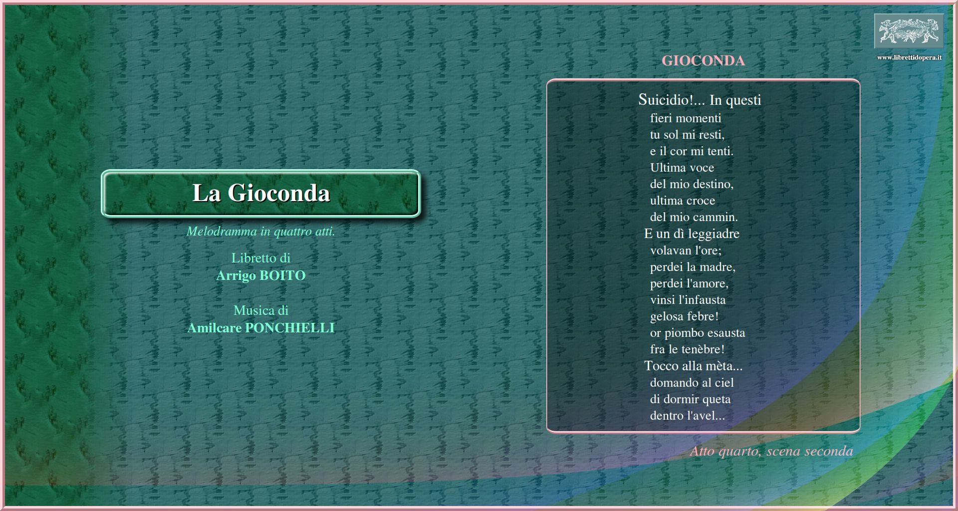 Feste e Pane! Regia e bolgia dogale! Atro portento! Laggiù nelle nebbie remote L'amo come il fulgor del creato! Là turbini e farnetichi Suicidio!... In questi