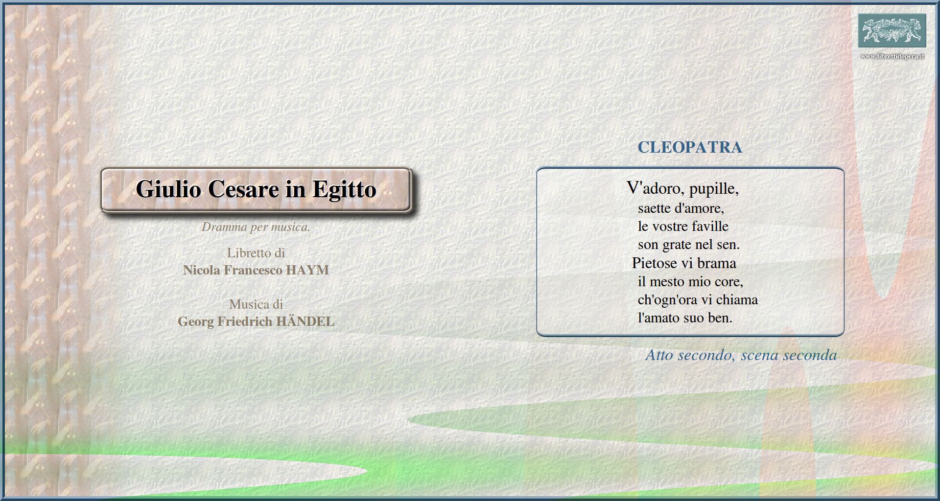 Empio, dirò, tu sei Tutto può donna vezzosa Non è sì vago e bello Va tacito e nascosto V'adoro, pupille Cessa omai di sospirare Piangerò la sorte mia La giustizia ha già sull'arco Da tempeste il legno infranto