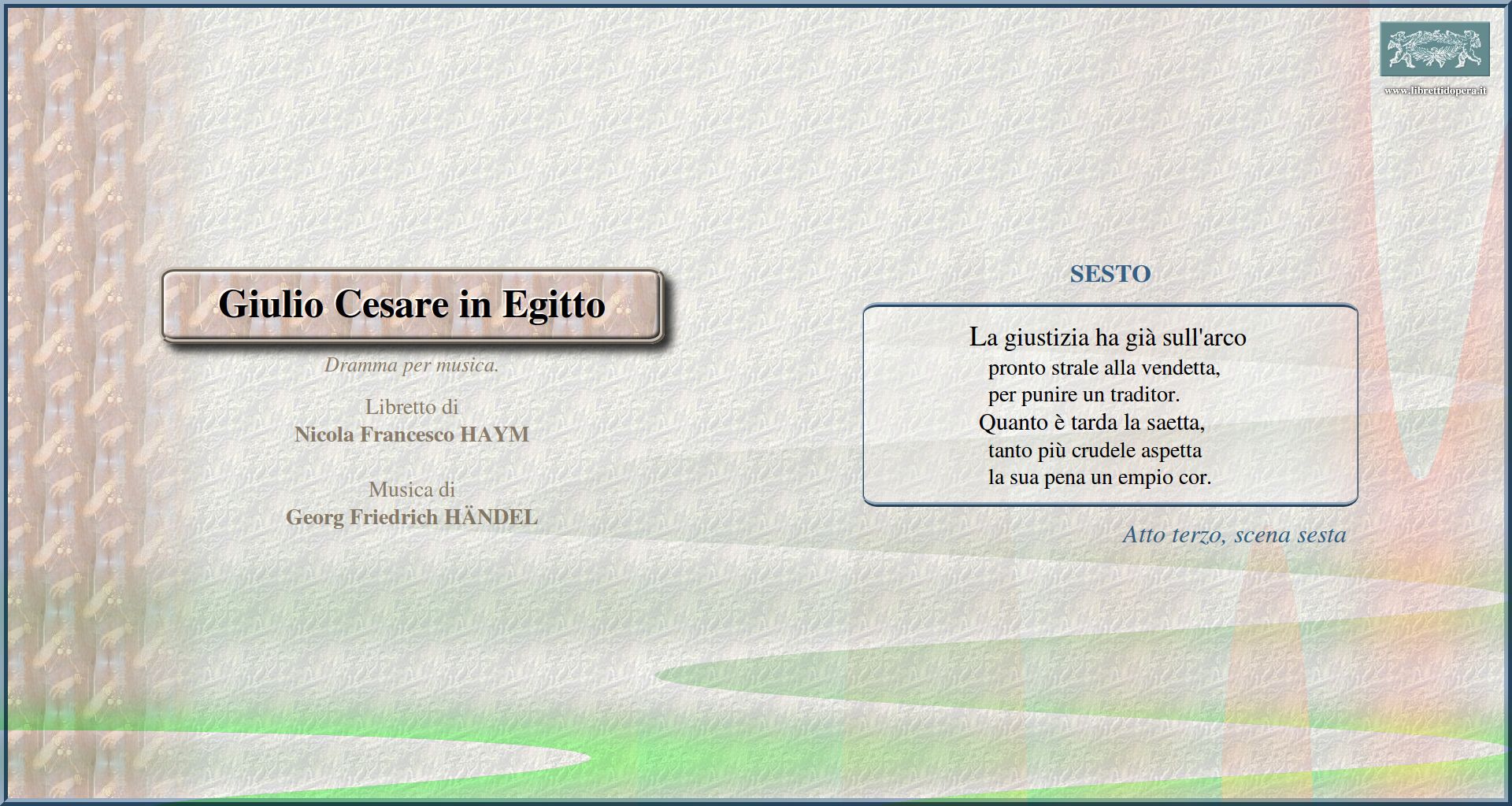 Empio, dirò, tu sei Tutto può donna vezzosa Non è sì vago e bello Va tacito e nascosto V'adoro, pupille Cessa omai di sospirare Piangerò la sorte mia La giustizia ha già sull'arco Da tempeste il legno infranto