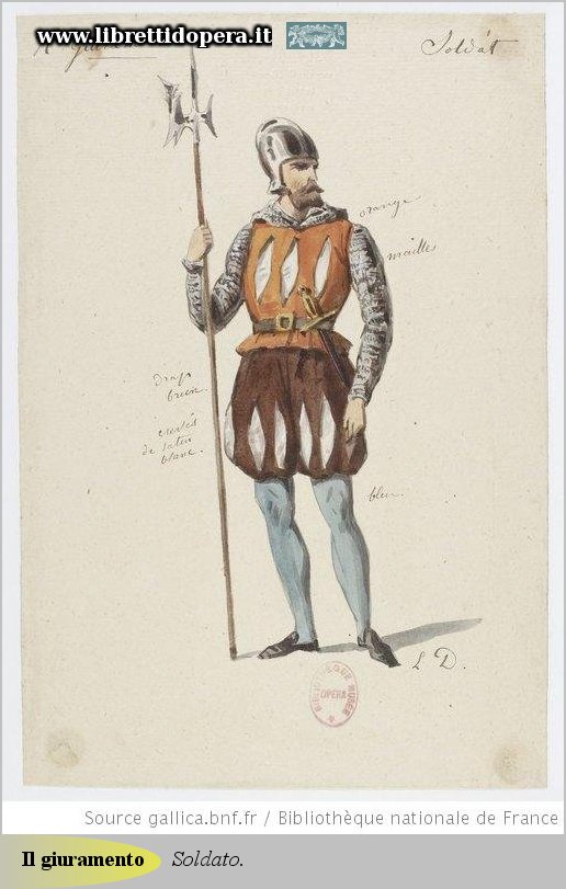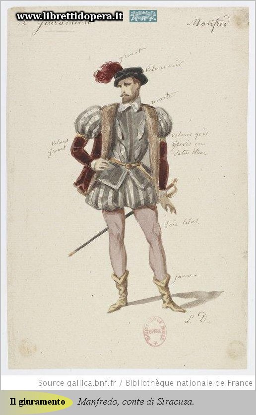 Scena dodicesima S'apre repente la gran porta di mezzo, e si presenta Manfredo; dopo lui due Scudieri e sei Guardie, che restano fuori della porta, da cui si vede una sala d'armi.