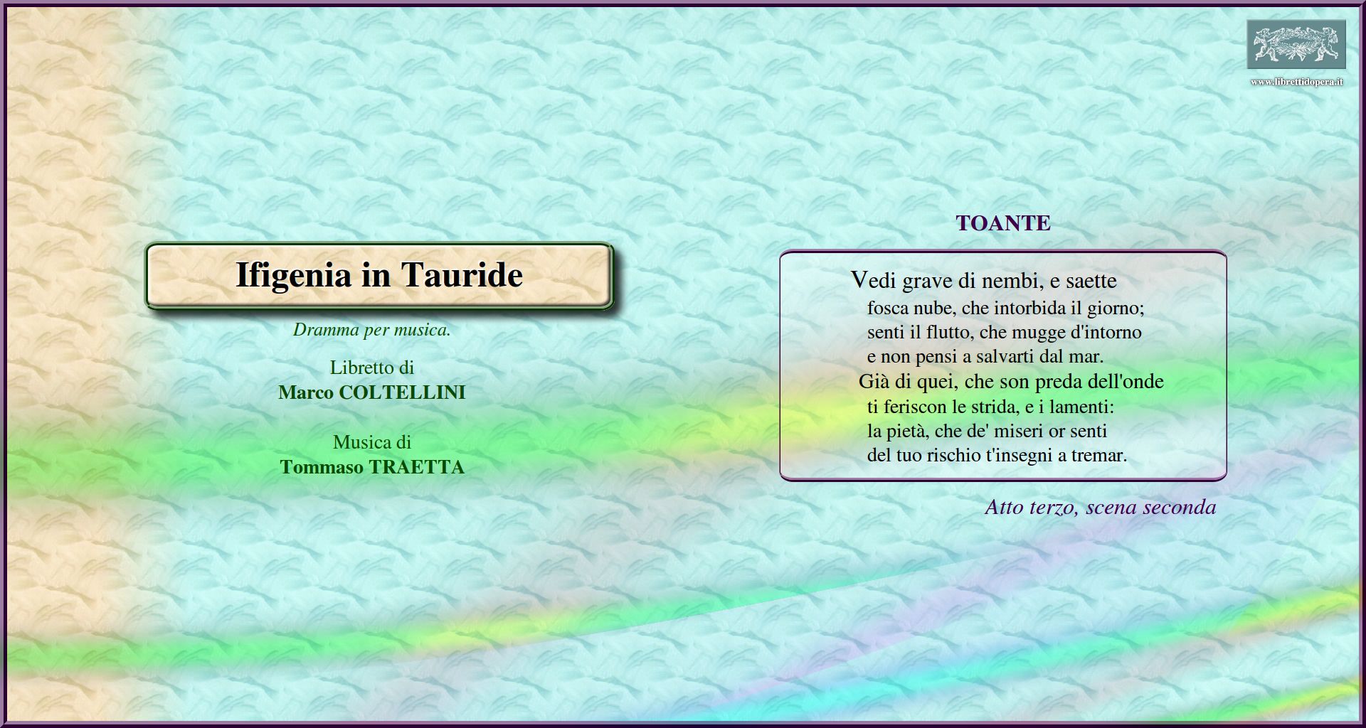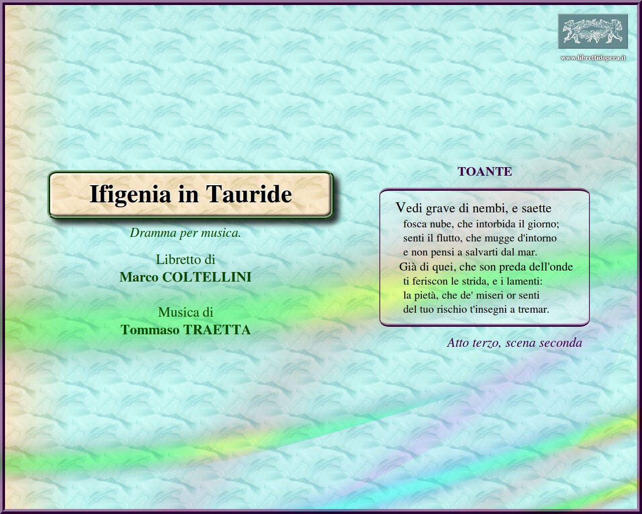 So, che pietà de' miseri Dormi Oreste! Ti scuote, ti desta Vedi grave di nembi, e saette