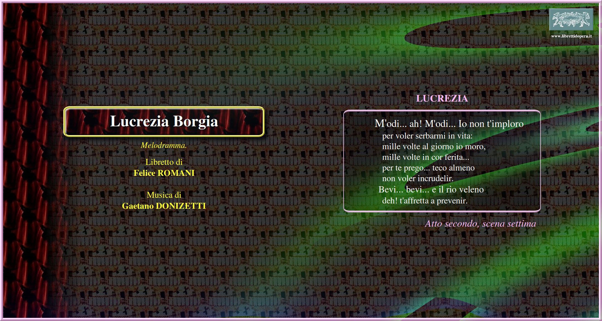 Mentre geme il cor sommesso Vieni: la mia vendetta Il segreto per esser felici M'odi... ah! M'odi... Io non t'imploro Era desso il figlio mio