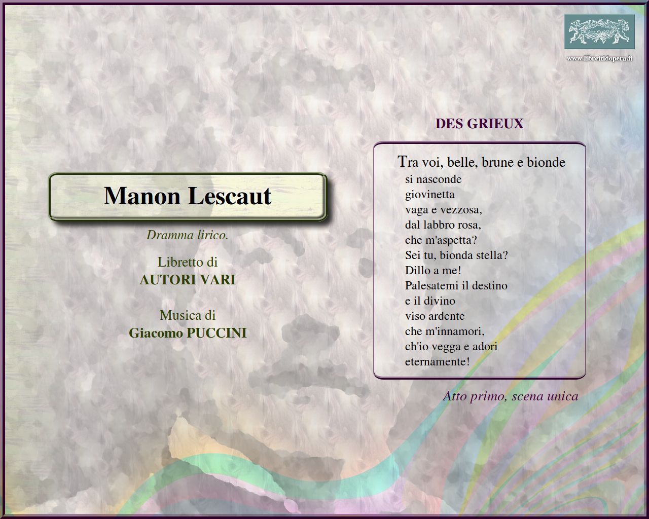 Donna non vidi mai simile a questa! Tra voi, belle, brune e bionde L'ora, o Tirsi, è vaga e bella Io voglio il tuo perdono Ah! Manon, mi tradisce In quelle trine morbide Ah! non v'avvicinate! Sola... perduta, abbandonata