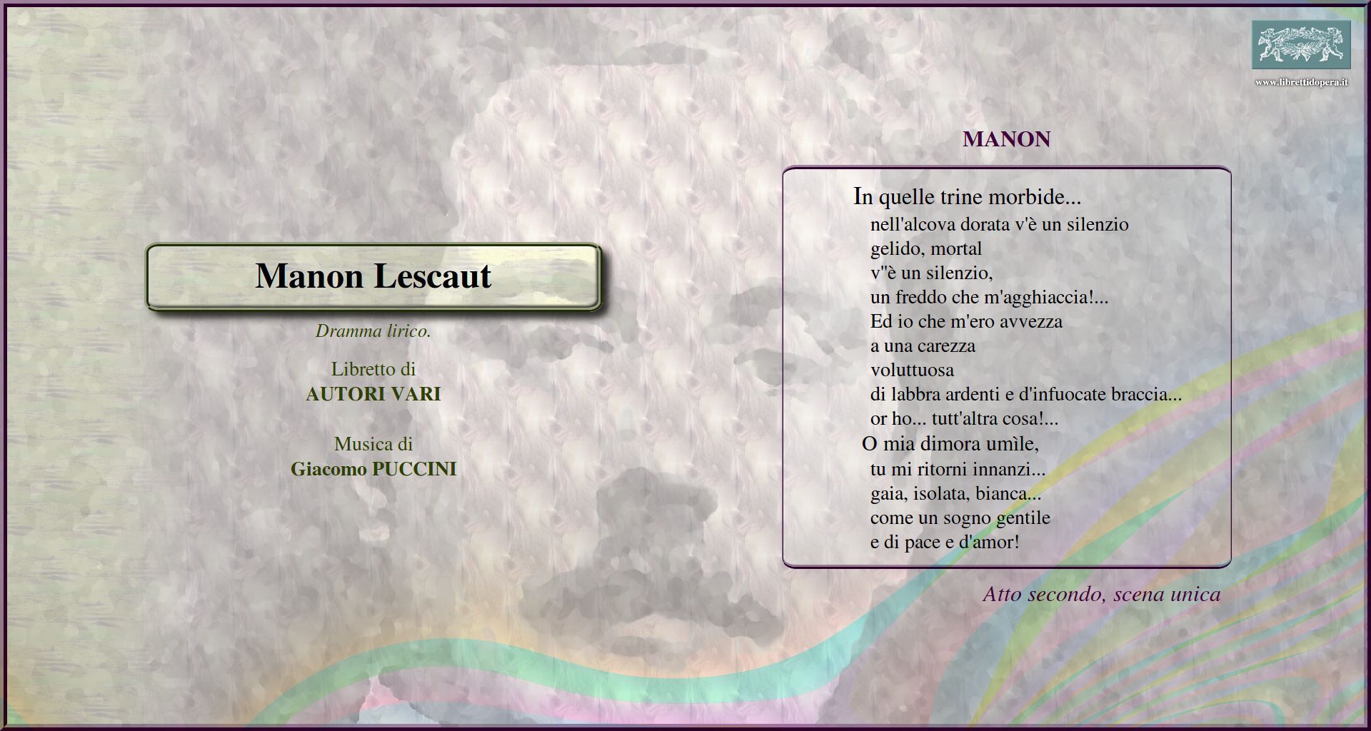 Donna non vidi mai simile a questa! Tra voi, belle, brune e bionde L'ora, o Tirsi, è vaga e bella Io voglio il tuo perdono Ah! Manon, mi tradisce In quelle trine morbide Ah! non v'avvicinate! Sola... perduta, abbandonata