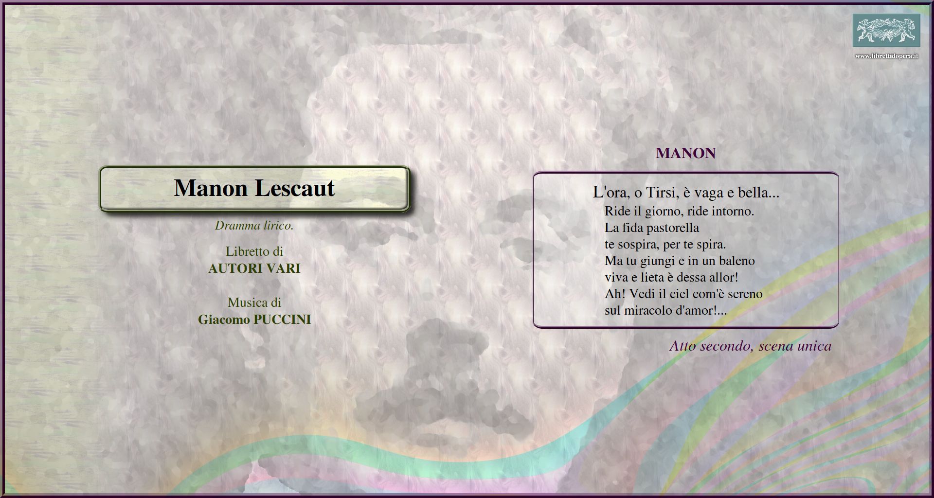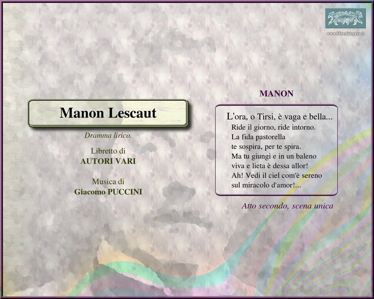 Donna non vidi mai simile a questa! Tra voi, belle, brune e bionde L'ora, o Tirsi, è vaga e bella Io voglio il tuo perdono Ah! Manon, mi tradisce In quelle trine morbide Ah! non v'avvicinate! Sola... perduta, abbandonata