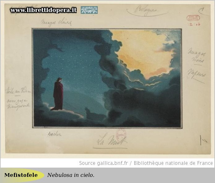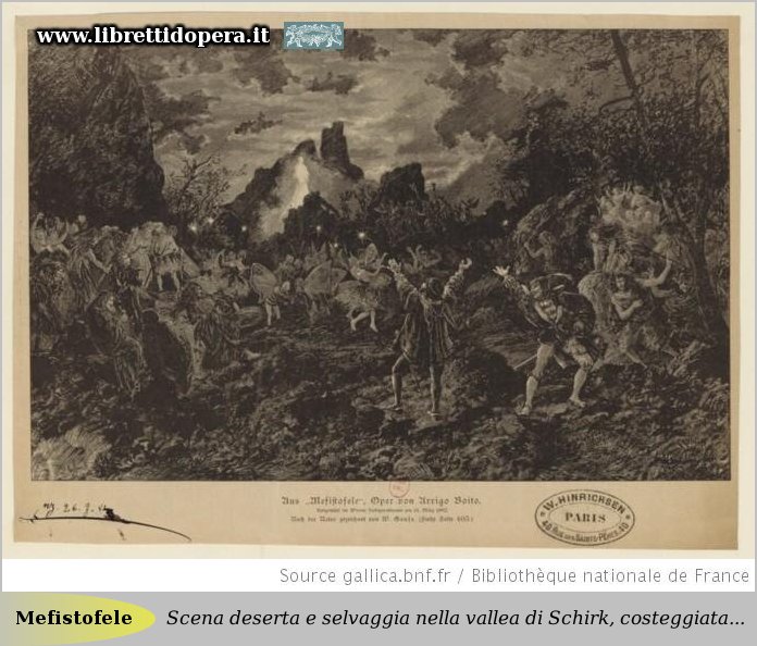 La notte del sabba. Scena deserta e selvaggia nella vallea di Schirk, costeggiata dagli spaventosi culmini del Bròcken (monte delle streghe). I sinistri profili delle roccie staccano in nero sul cielo grigio, un'aurora rossiccia di luna illumina stranamente la scena. Una caverna da un lato. Il picco di Rosstrappe a sinistra.