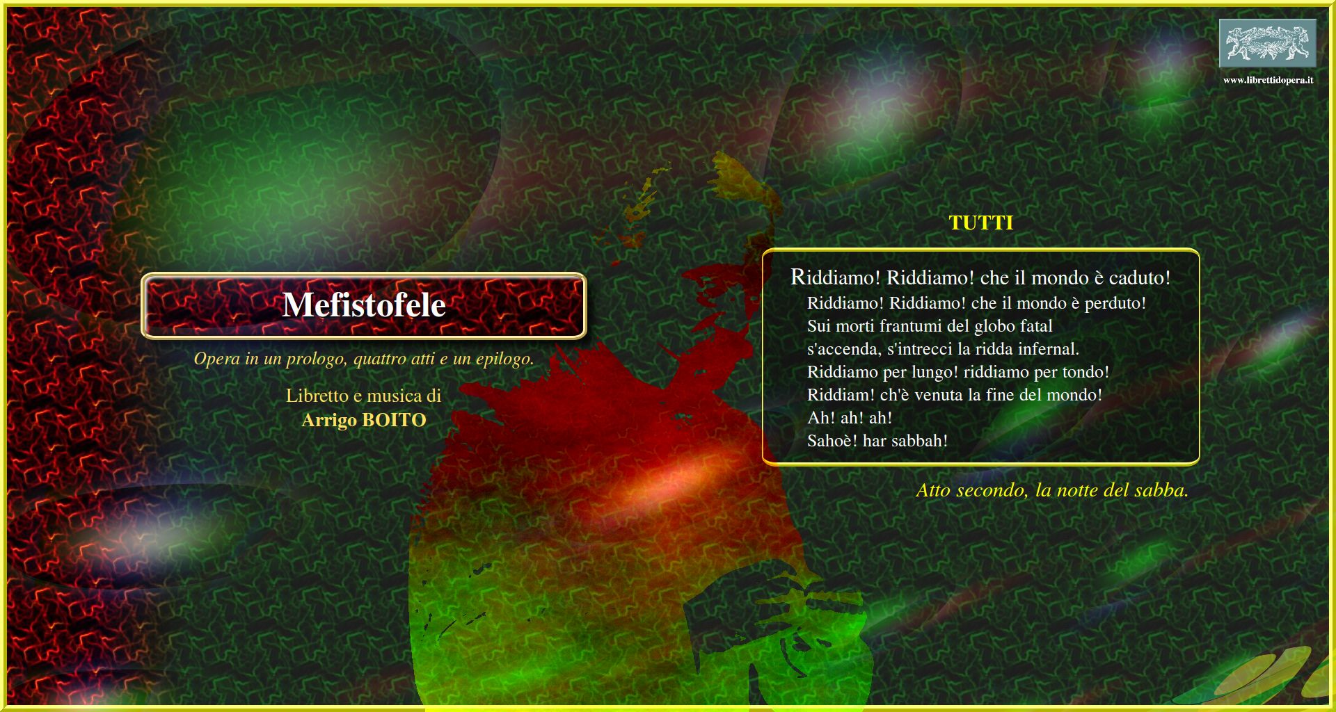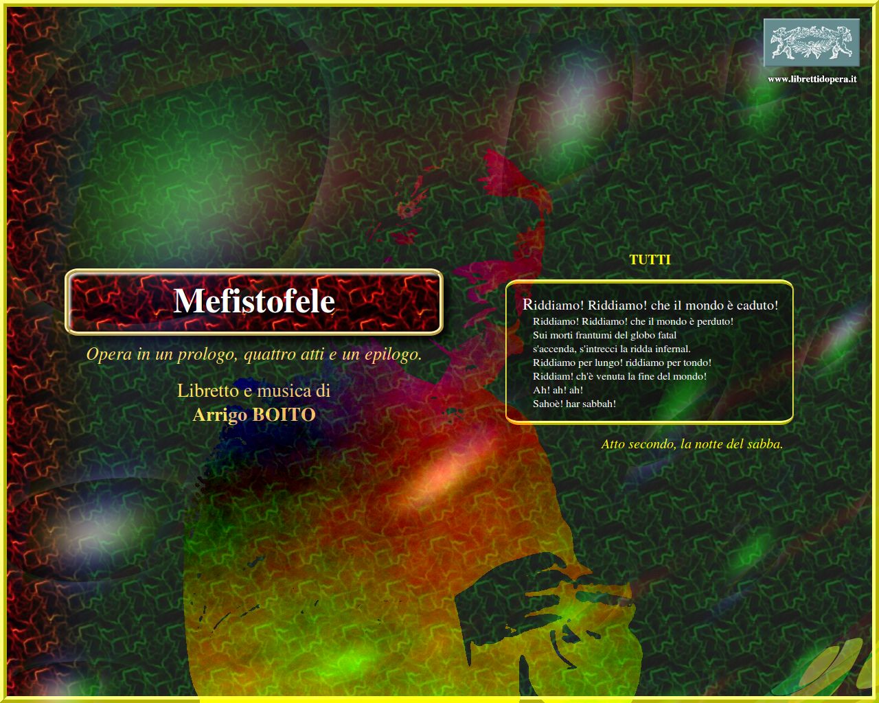 Ave signor. Perdona se il mio gergo Son lo spirito che nega Riddiamo! Riddiamo! che il mondo è caduto! Ecco il mondo Lontano, lontano, lontano Forma ideal, purissima Giunto sul passo estremo