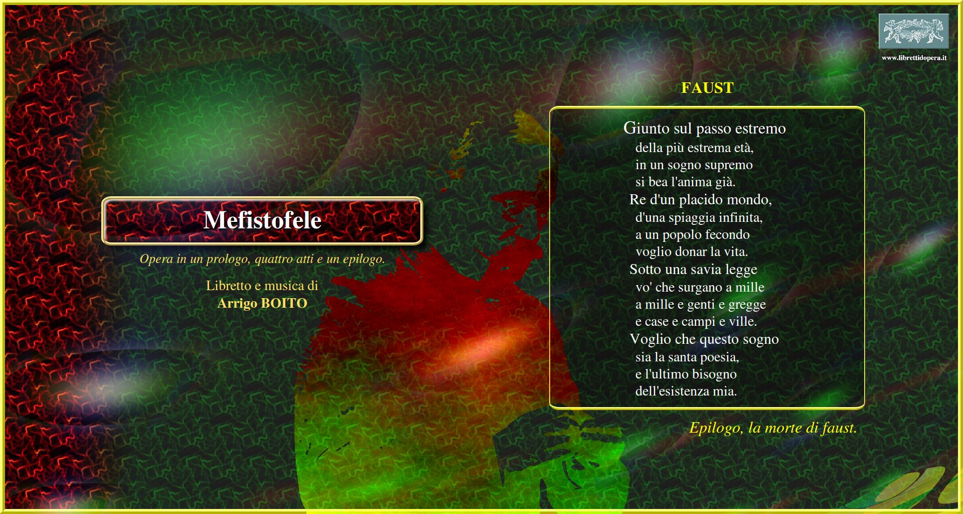 Ave signor. Perdona se il mio gergo Son lo spirito che nega Riddiamo! Riddiamo! che il mondo è caduto! Ecco il mondo Lontano, lontano, lontano Forma ideal, purissima Giunto sul passo estremo