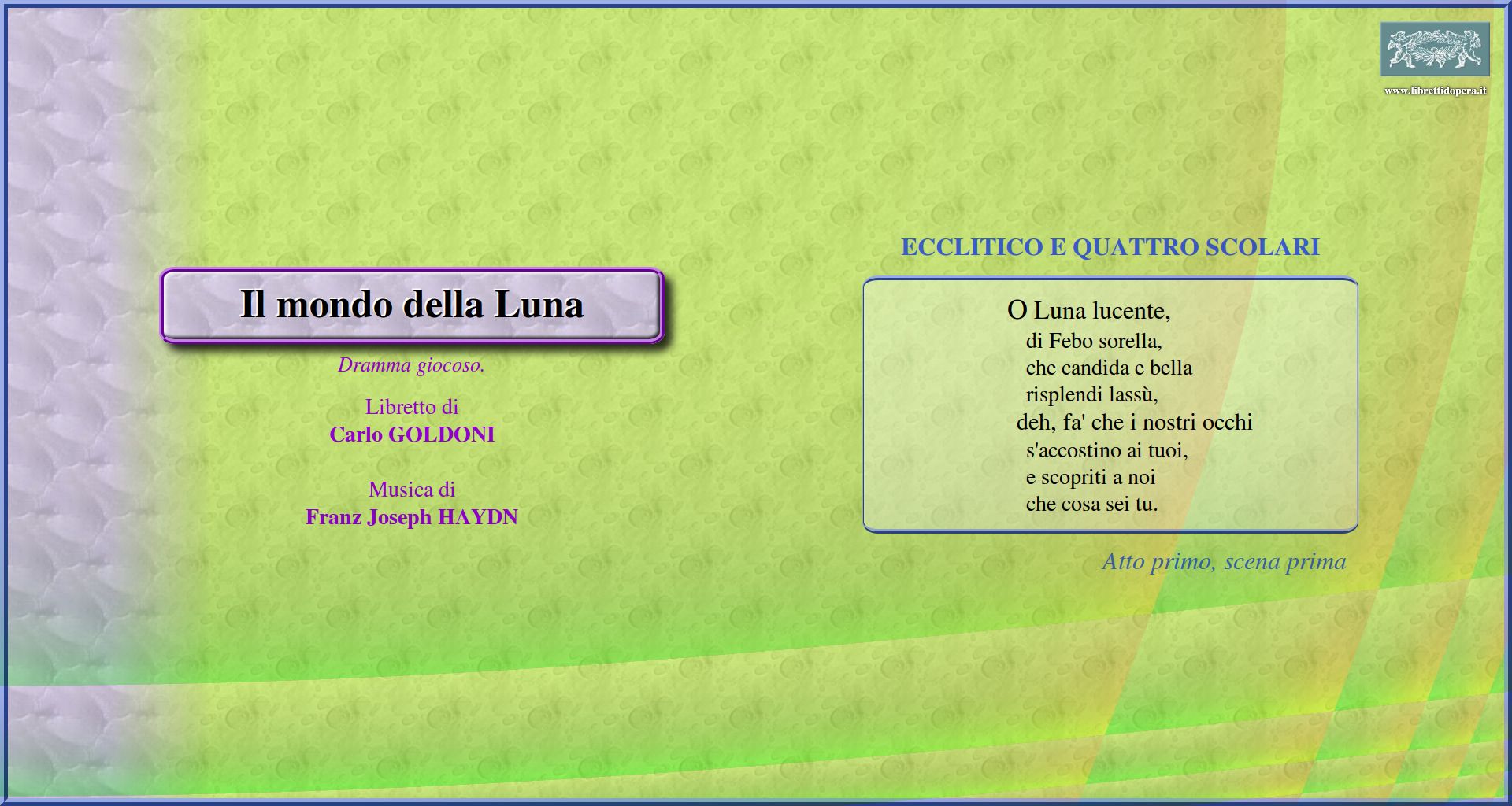 O Luna lucente Quanti sciocchi mortali Ragion nell'alma siede Un avaro suda e pena Un certo ruscelletto