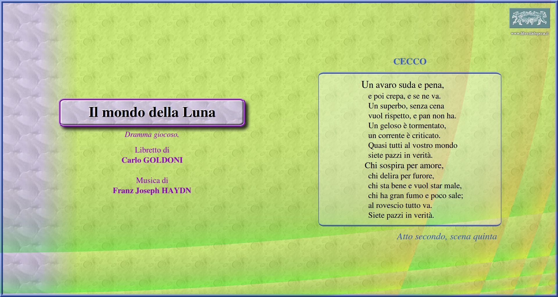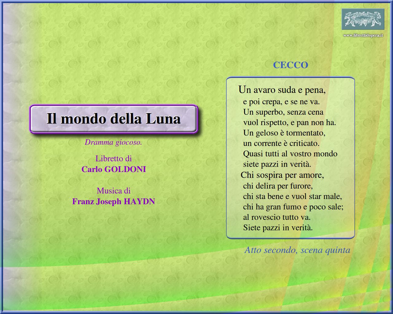 O Luna lucente Quanti sciocchi mortali Ragion nell'alma siede Un avaro suda e pena Un certo ruscelletto