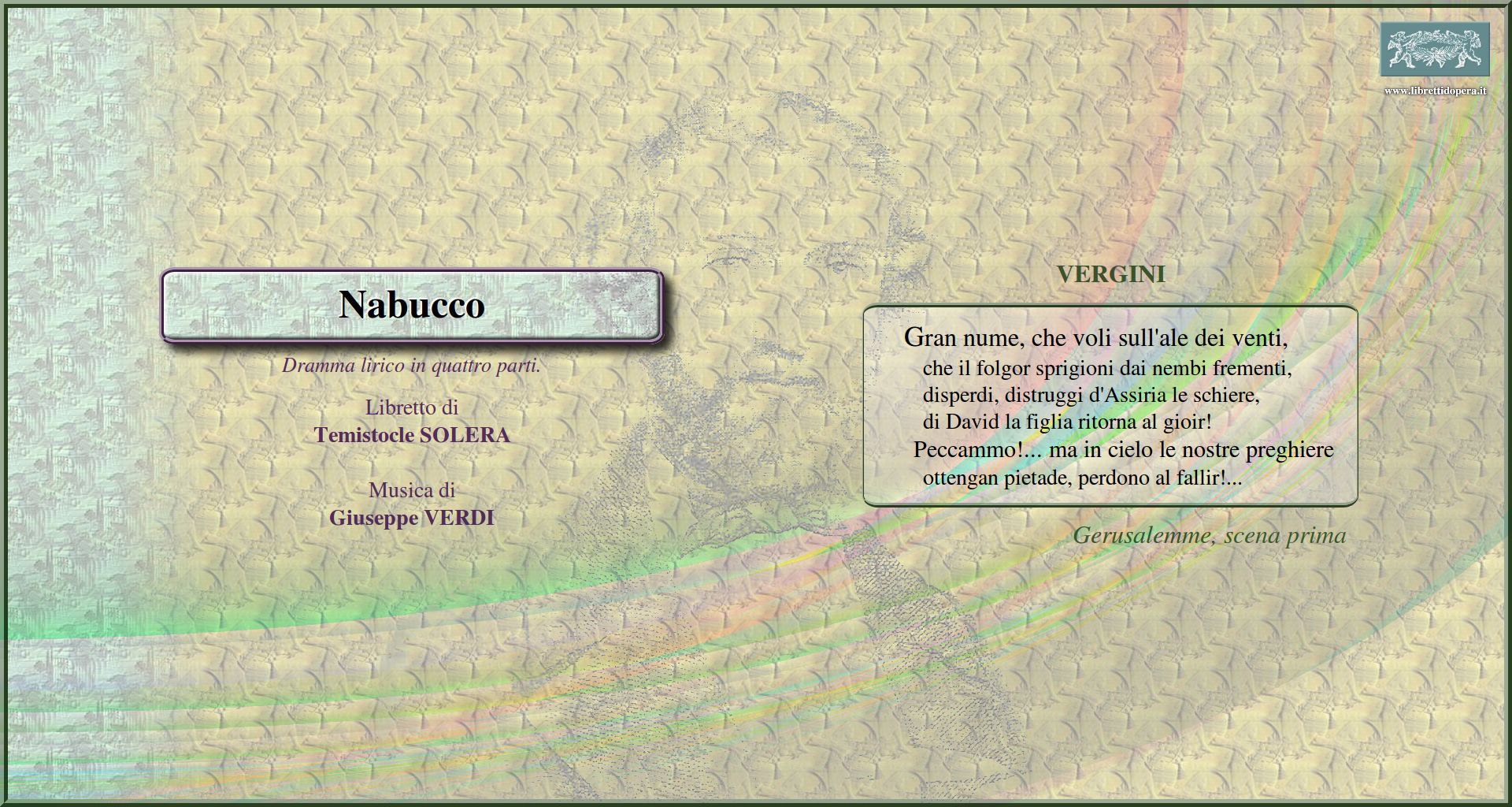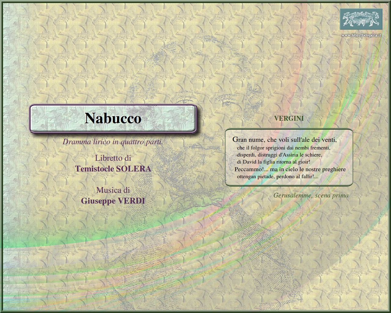 Gran nume, che voli sull'ale dei venti Mio furor, non più costretto Anch'io dischiuso un giorno Tu sul labbro de' veggenti Chi mi toglie il regio scettro? S'appressan gl'istanti Va', pensiero, sull'ali dorate Va'! la palma del martirio Immenso jehovha