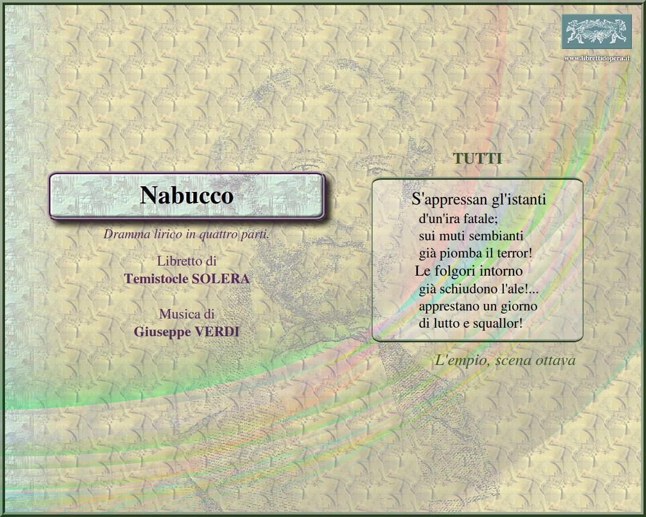 Gran nume, che voli sull'ale dei venti Mio furor, non più costretto Anch'io dischiuso un giorno Tu sul labbro de' veggenti Chi mi toglie il regio scettro? S'appressan gl'istanti Va', pensiero, sull'ali dorate Va'! la palma del martirio Immenso jehovha