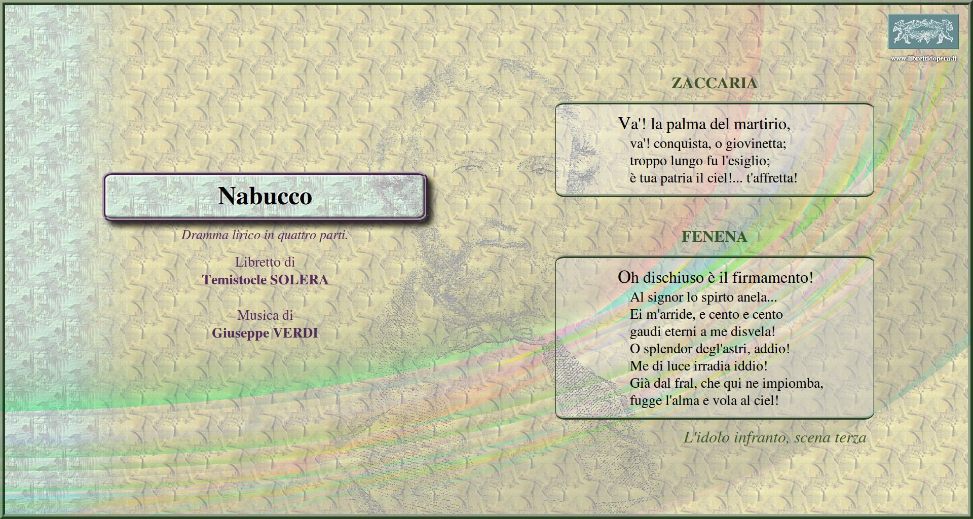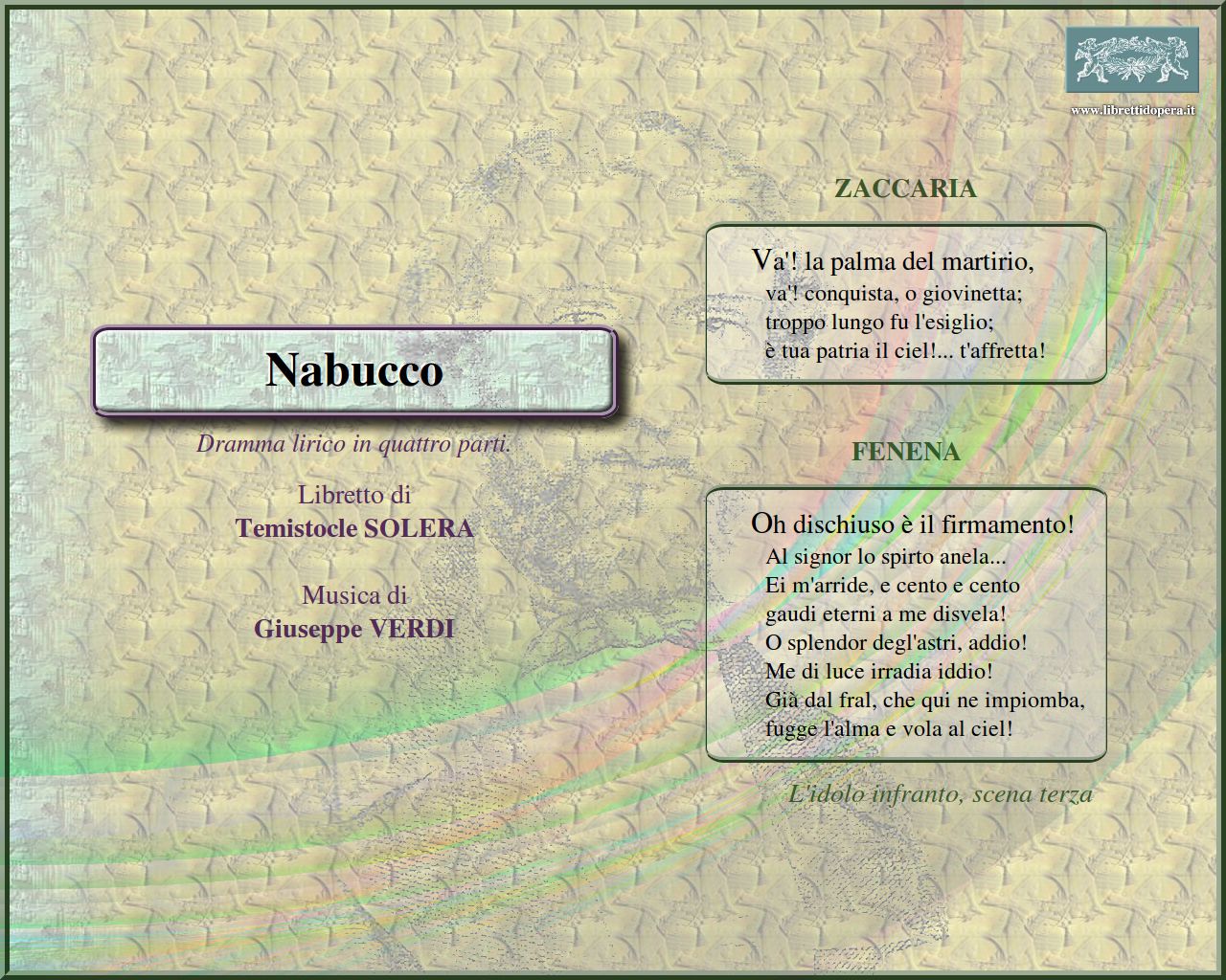 Gran nume, che voli sull'ale dei venti Mio furor, non più costretto Anch'io dischiuso un giorno Tu sul labbro de' veggenti Chi mi toglie il regio scettro? S'appressan gl'istanti Va', pensiero, sull'ali dorate Va'! la palma del martirio Immenso jehovha
