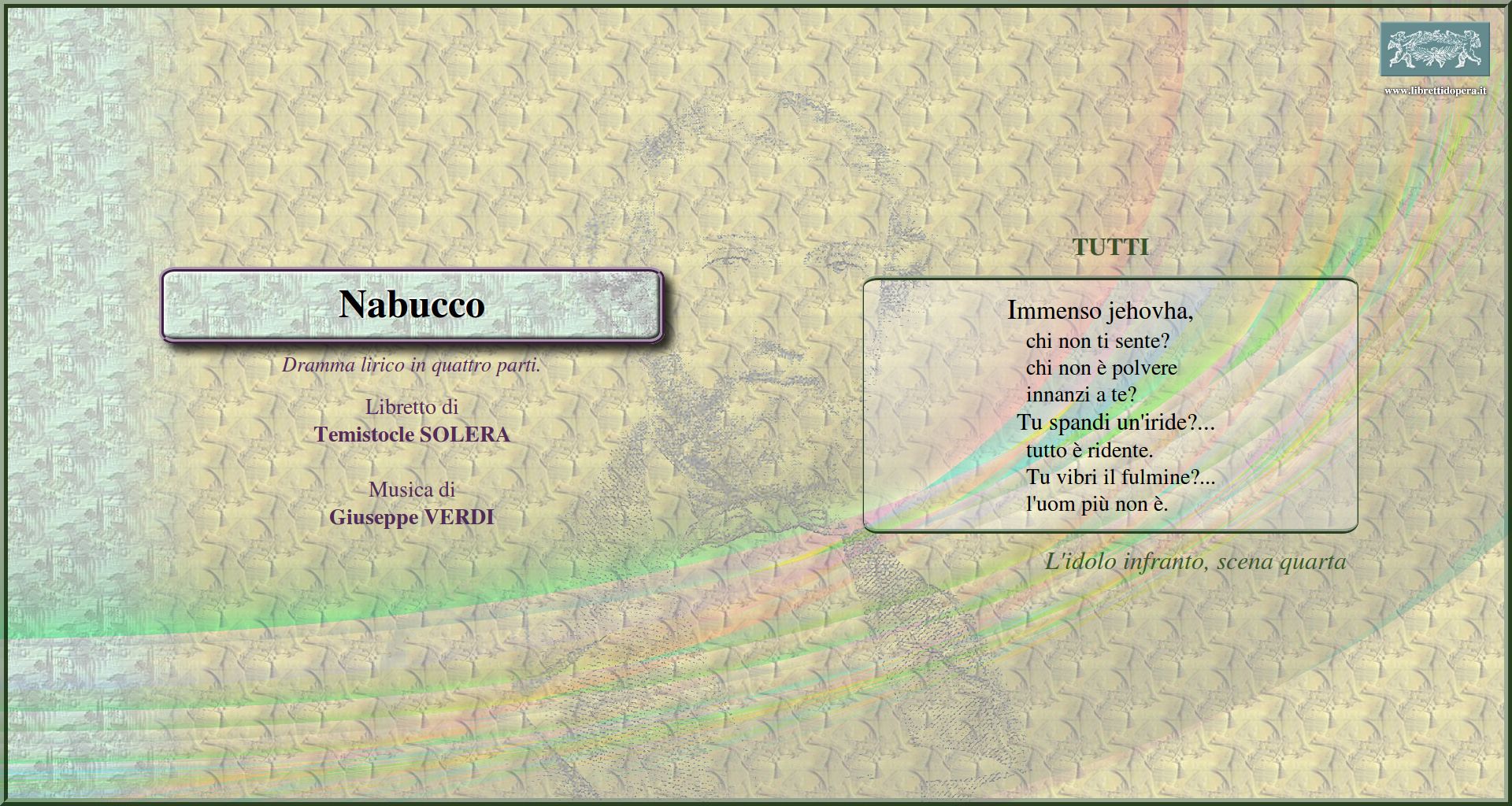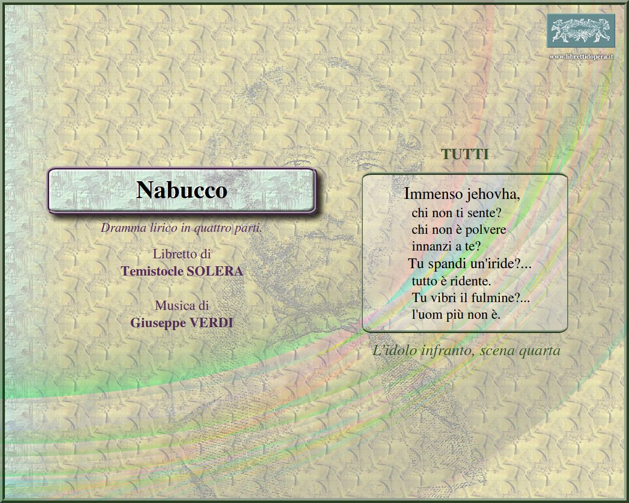 Gran nume, che voli sull'ale dei venti Mio furor, non più costretto Anch'io dischiuso un giorno Tu sul labbro de' veggenti Chi mi toglie il regio scettro? S'appressan gl'istanti Va', pensiero, sull'ali dorate Va'! la palma del martirio Immenso jehovha