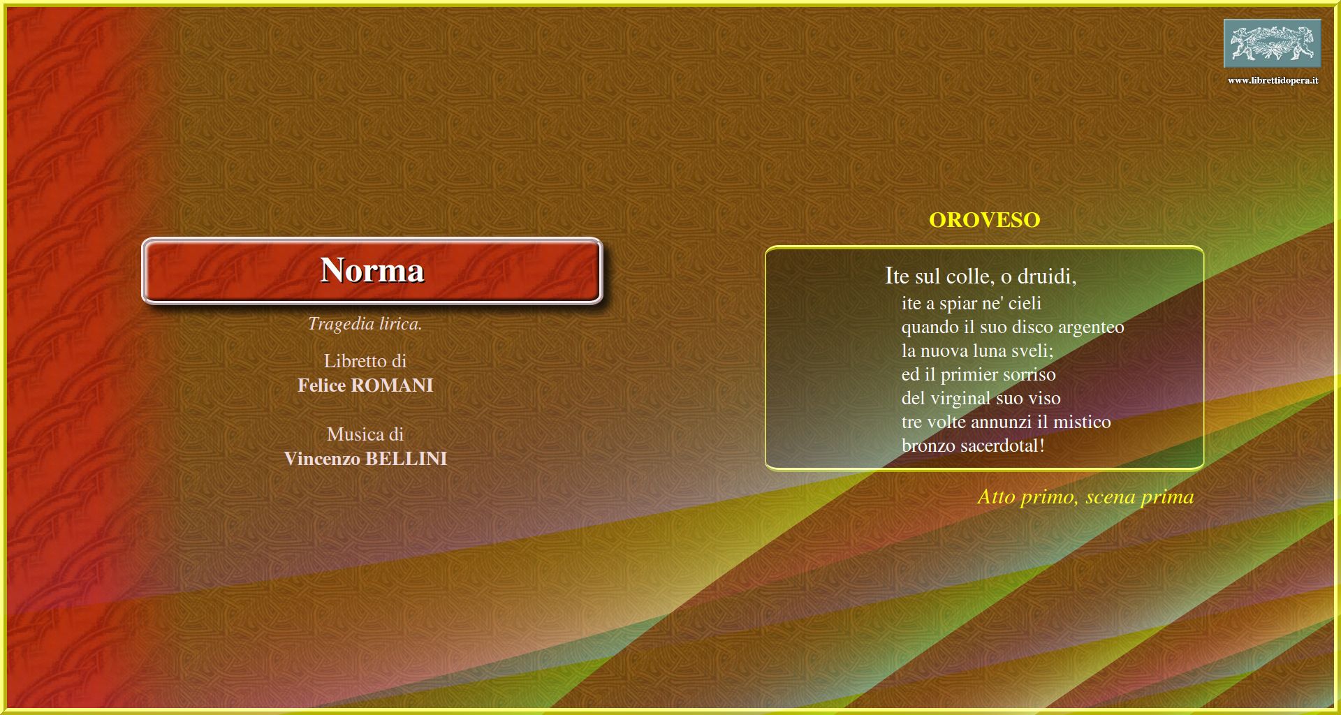 Pagina della partitura Ite sul colle, o druidi Me protegge, me difende Meco all'altar di Venere Ah! bello a me ritorna Casta diva, che inargenti Va', crudele; al dio spietato Oh, non tremare, o perfido Dormono entrambi... non vedran la mano Deh! con te, con te, li prendi Guerra, guerra! Le galliche selve Qual cor tradisti, qual cor perdesti