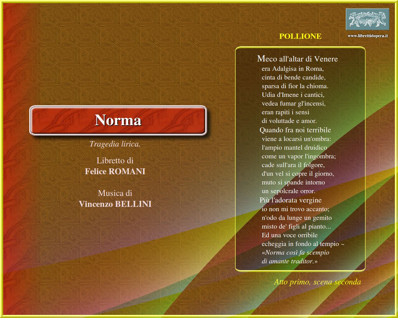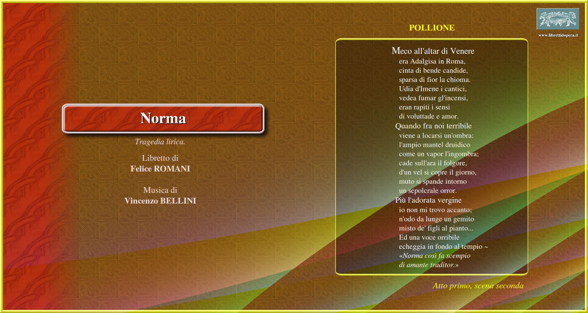 Pagina della partitura Ite sul colle, o druidi Me protegge, me difende Meco all'altar di Venere Ah! bello a me ritorna Casta diva, che inargenti Va', crudele; al dio spietato Oh, non tremare, o perfido Dormono entrambi... non vedran la mano Deh! con te, con te, li prendi Guerra, guerra! Le galliche selve Qual cor tradisti, qual cor perdesti