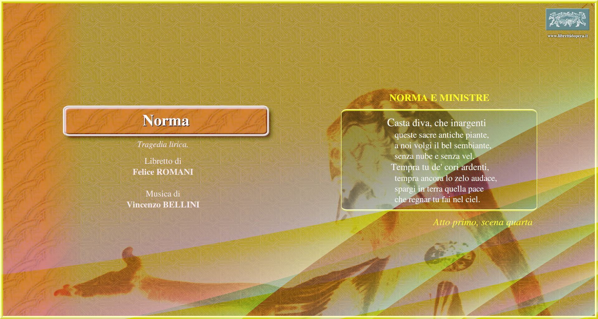 Pagina della partitura Ite sul colle, o druidi Me protegge, me difende Meco all'altar di Venere Ah! bello a me ritorna Casta diva, che inargenti Va', crudele; al dio spietato Oh, non tremare, o perfido Dormono entrambi... non vedran la mano Deh! con te, con te, li prendi Guerra, guerra! Le galliche selve Qual cor tradisti, qual cor perdesti