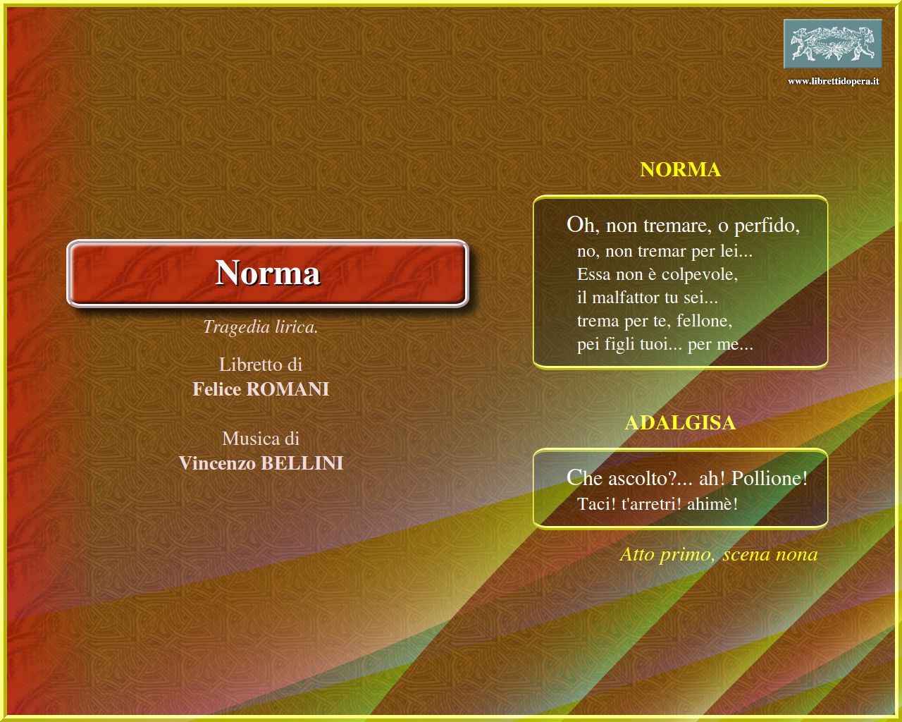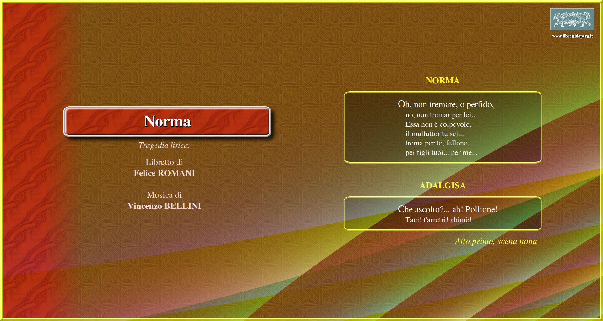 Pagina della partitura Ite sul colle, o druidi Me protegge, me difende Meco all'altar di Venere Ah! bello a me ritorna Casta diva, che inargenti Va', crudele; al dio spietato Oh, non tremare, o perfido Dormono entrambi... non vedran la mano Deh! con te, con te, li prendi Guerra, guerra! Le galliche selve Qual cor tradisti, qual cor perdesti