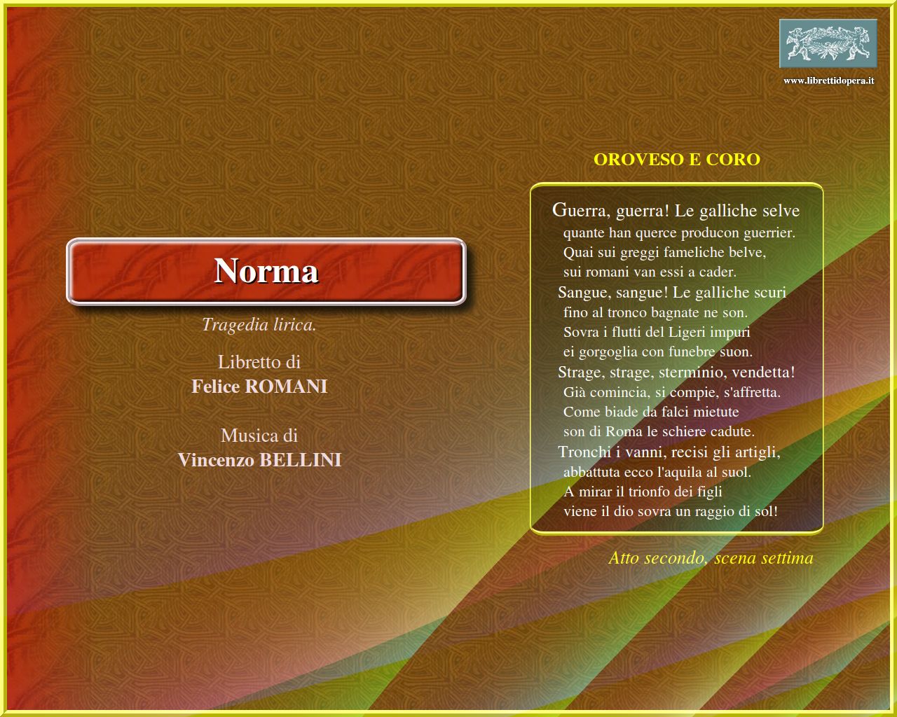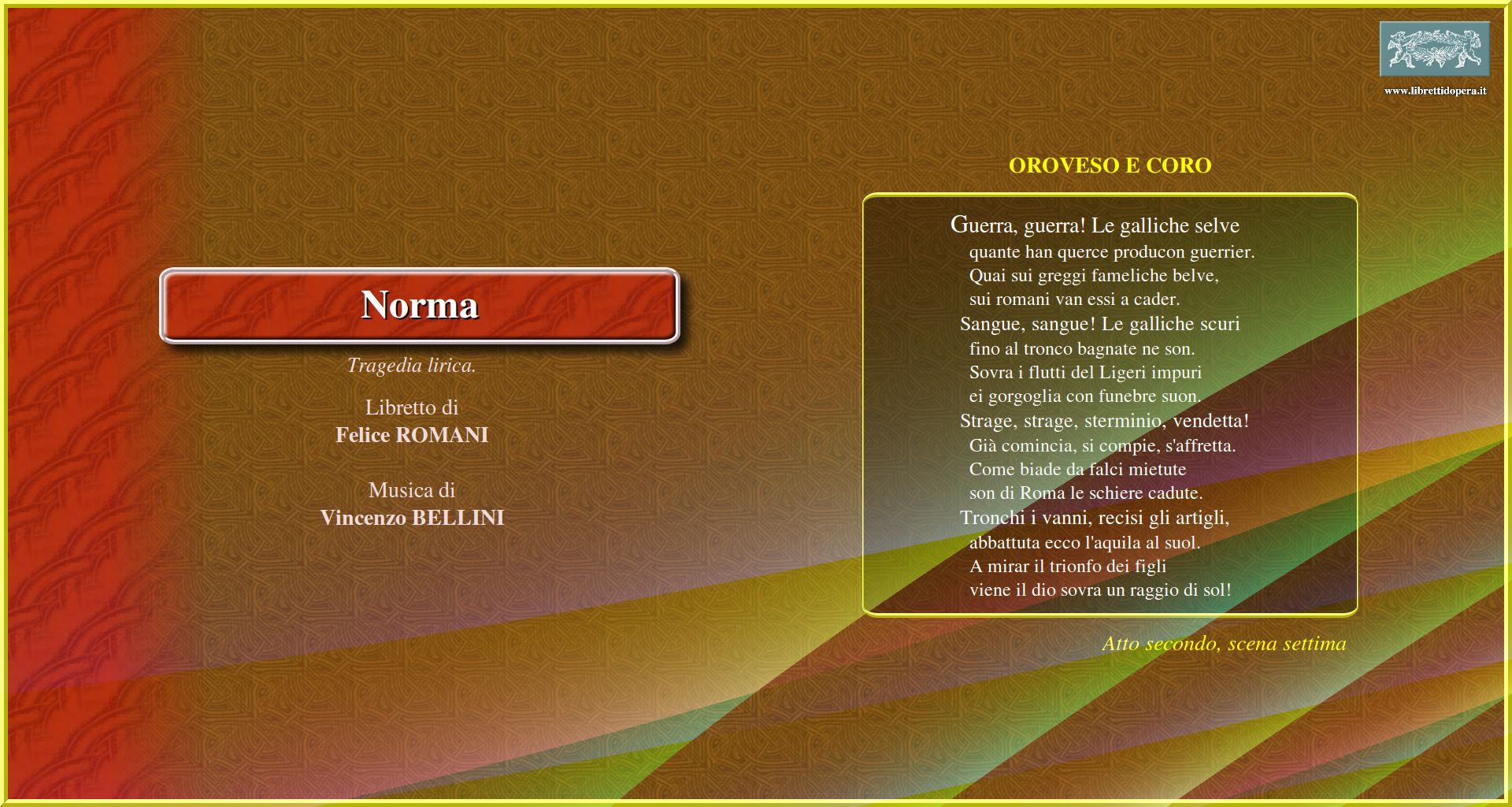 Pagina della partitura Ite sul colle, o druidi Me protegge, me difende Meco all'altar di Venere Ah! bello a me ritorna Casta diva, che inargenti Va', crudele; al dio spietato Oh, non tremare, o perfido Dormono entrambi... non vedran la mano Deh! con te, con te, li prendi Guerra, guerra! Le galliche selve Qual cor tradisti, qual cor perdesti