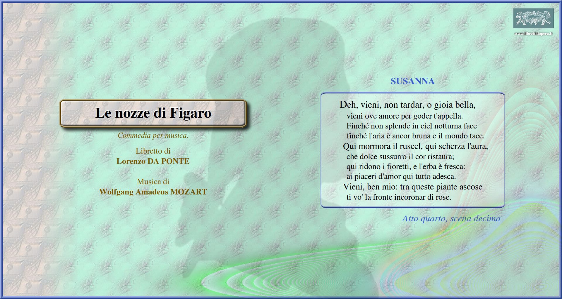 Se vuol ballare Non so più cosa son, cosa faccio Non più andrai, farfallone amoroso Porgi, amor, qualche ristoro Voi che sapete Dove sono i bei momenti Aprite un po' quegli occhi Deh, vieni, non tardar, o gioia bella