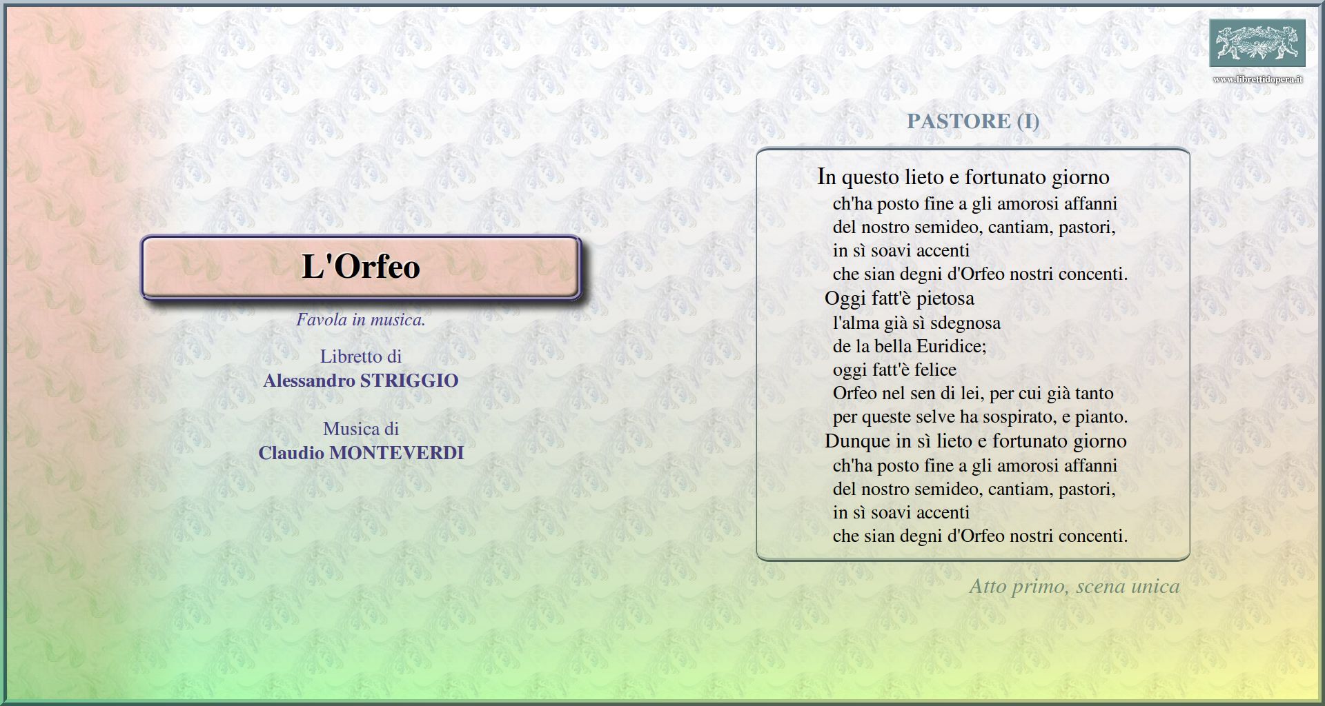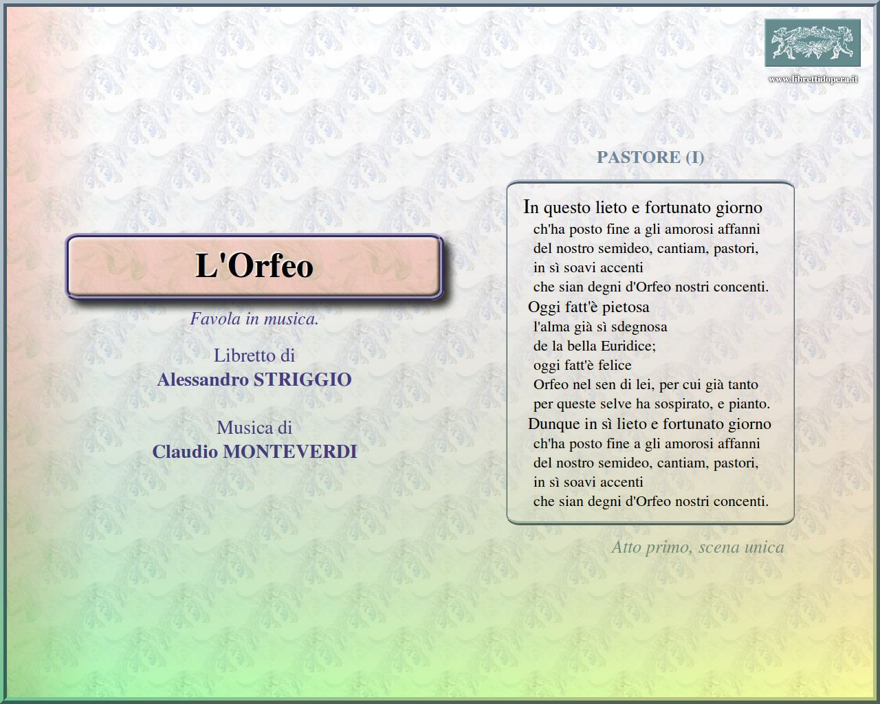In questo lieto e fortunato giorno In un fiorito prato Tu se' morta, mia vita, ed io respiro? Vi ricorda, o boschi ombrosi
