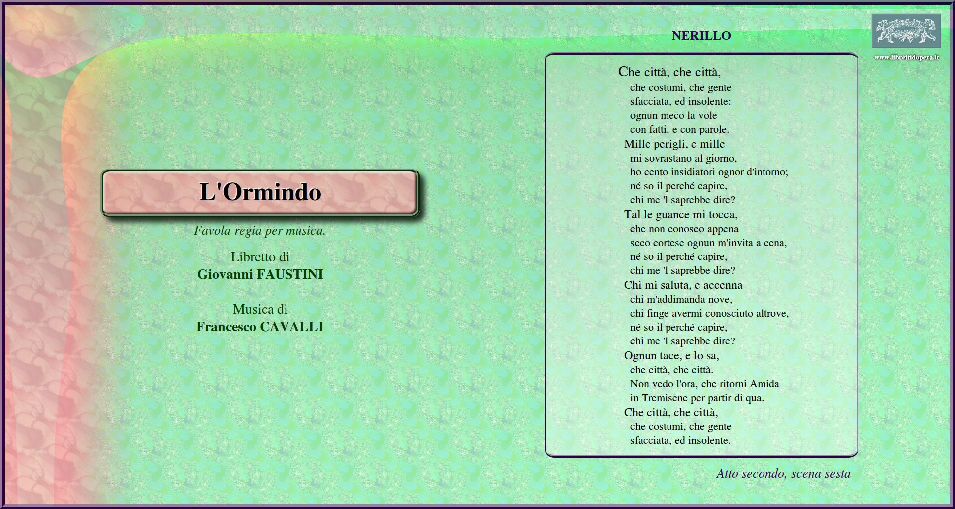 Non m'è patria l'Olimpo O sciocchi amanti, o sciocchi Che città, che città Invan spendete l'ore Ti seguo anima mia