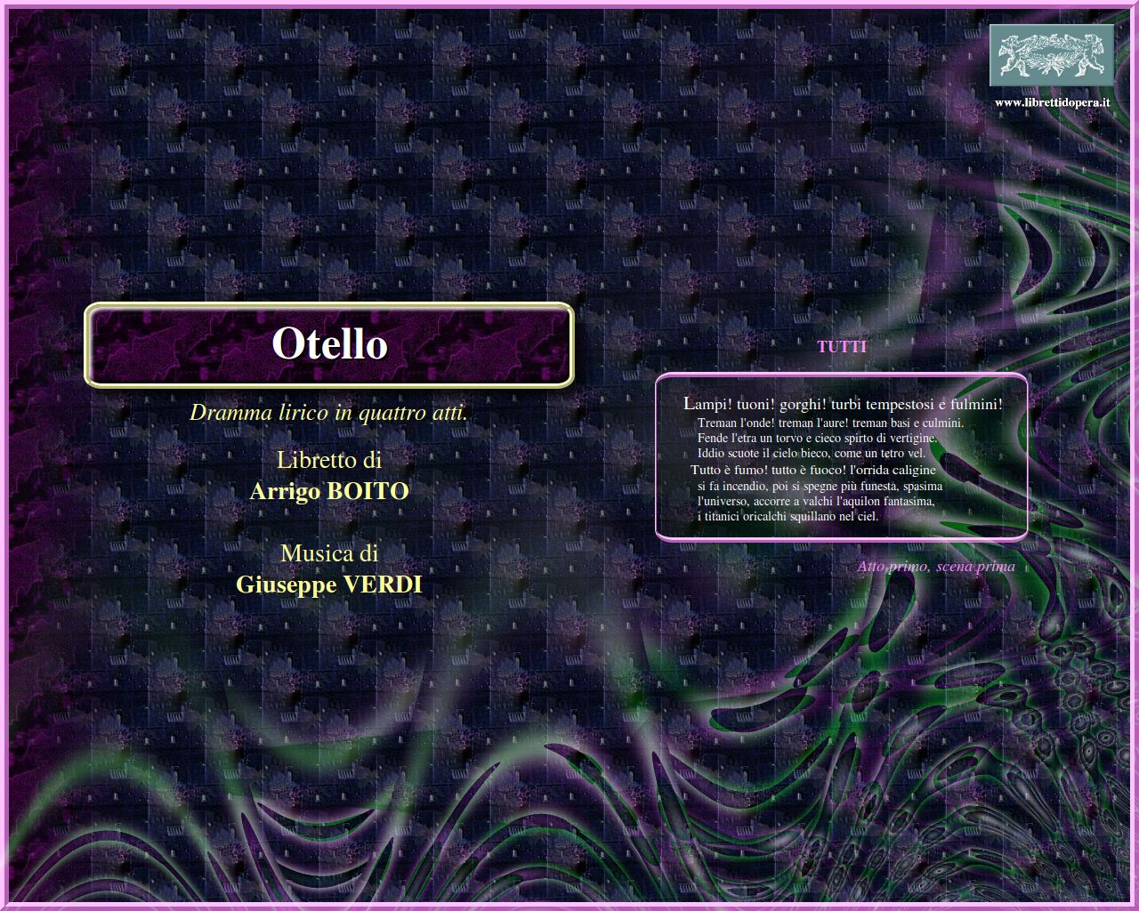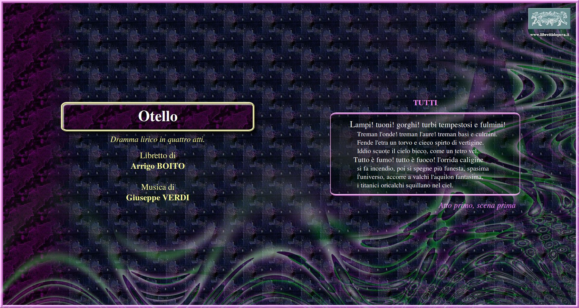 Dio, fulgor della bufera! Lampi! tuoni! gorghi! turbi tempestosi e fulmini! Già nella notte densa Credo in un dio crudel che m'ha creato Un detto può ricondur la fede Era la notte, Cassio dormìa, gli stavo accanto Ora e per sempre addio sante memorie Dio! mi potevi scagliar tutti i mali Quest'è una ragna A terra!... sì... nel livido Piangea cantando Ave Maria, piena di grazia, eletta