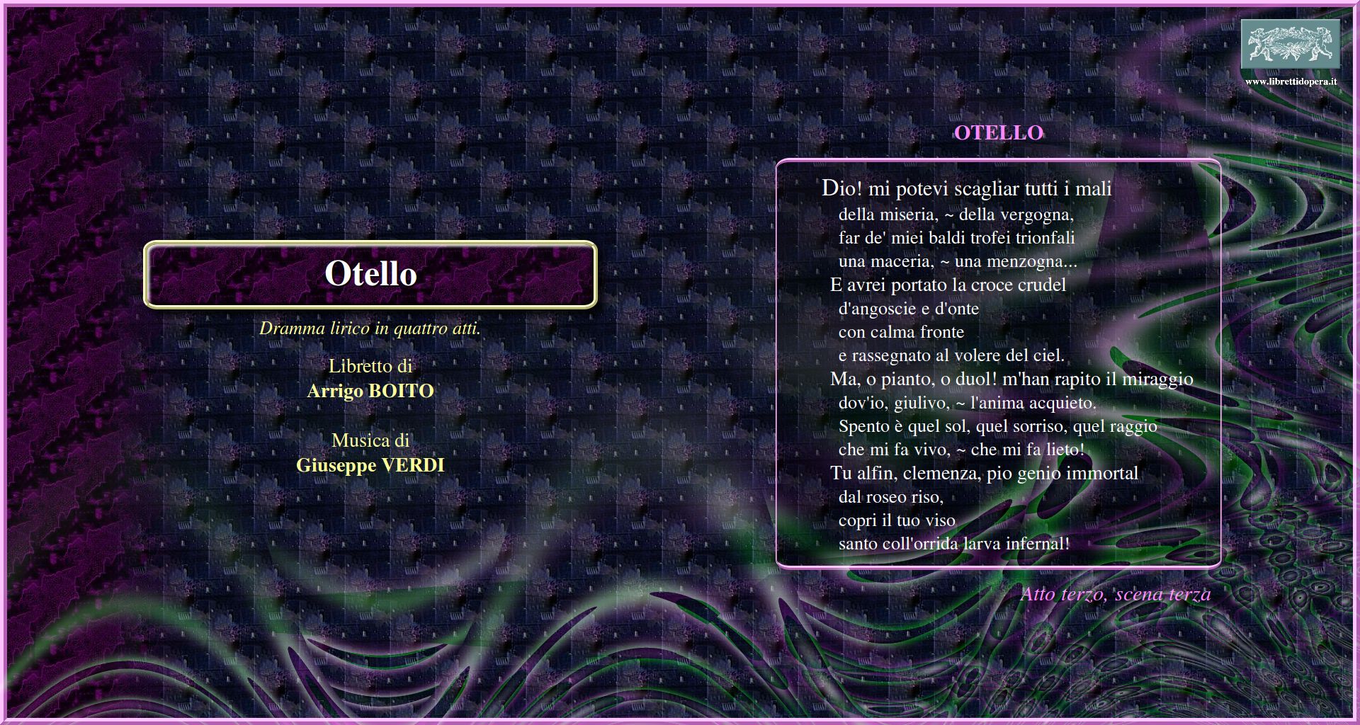 Dio, fulgor della bufera! Lampi! tuoni! gorghi! turbi tempestosi e fulmini! Già nella notte densa Credo in un dio crudel che m'ha creato Un detto può ricondur la fede Era la notte, Cassio dormìa, gli stavo accanto Ora e per sempre addio sante memorie Dio! mi potevi scagliar tutti i mali Quest'è una ragna A terra!... sì... nel livido Piangea cantando Ave Maria, piena di grazia, eletta