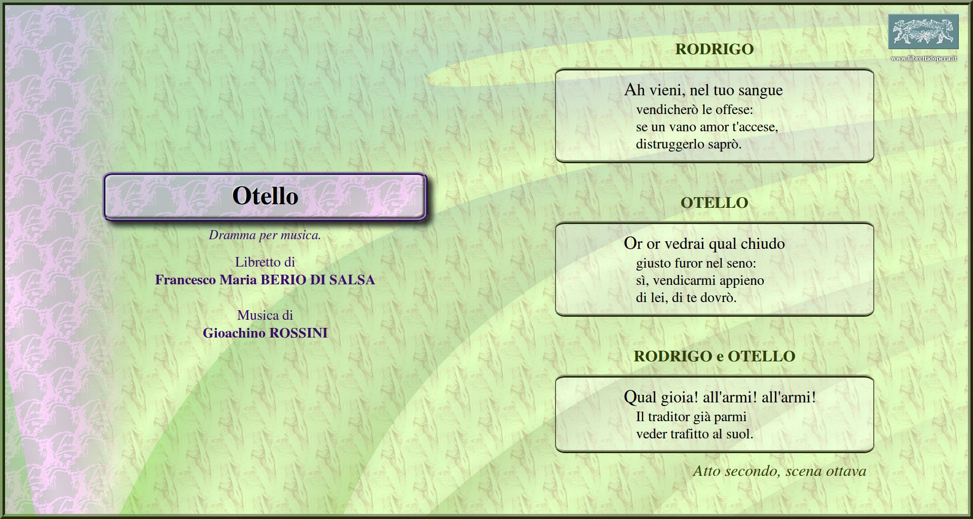 Ah sì, per voi già sento Incerta l'anima Ah vieni, nel tuo sangue Che smania! ahimè! che affanno? Assisa a' piè d'un salice Non arrestare il colpo