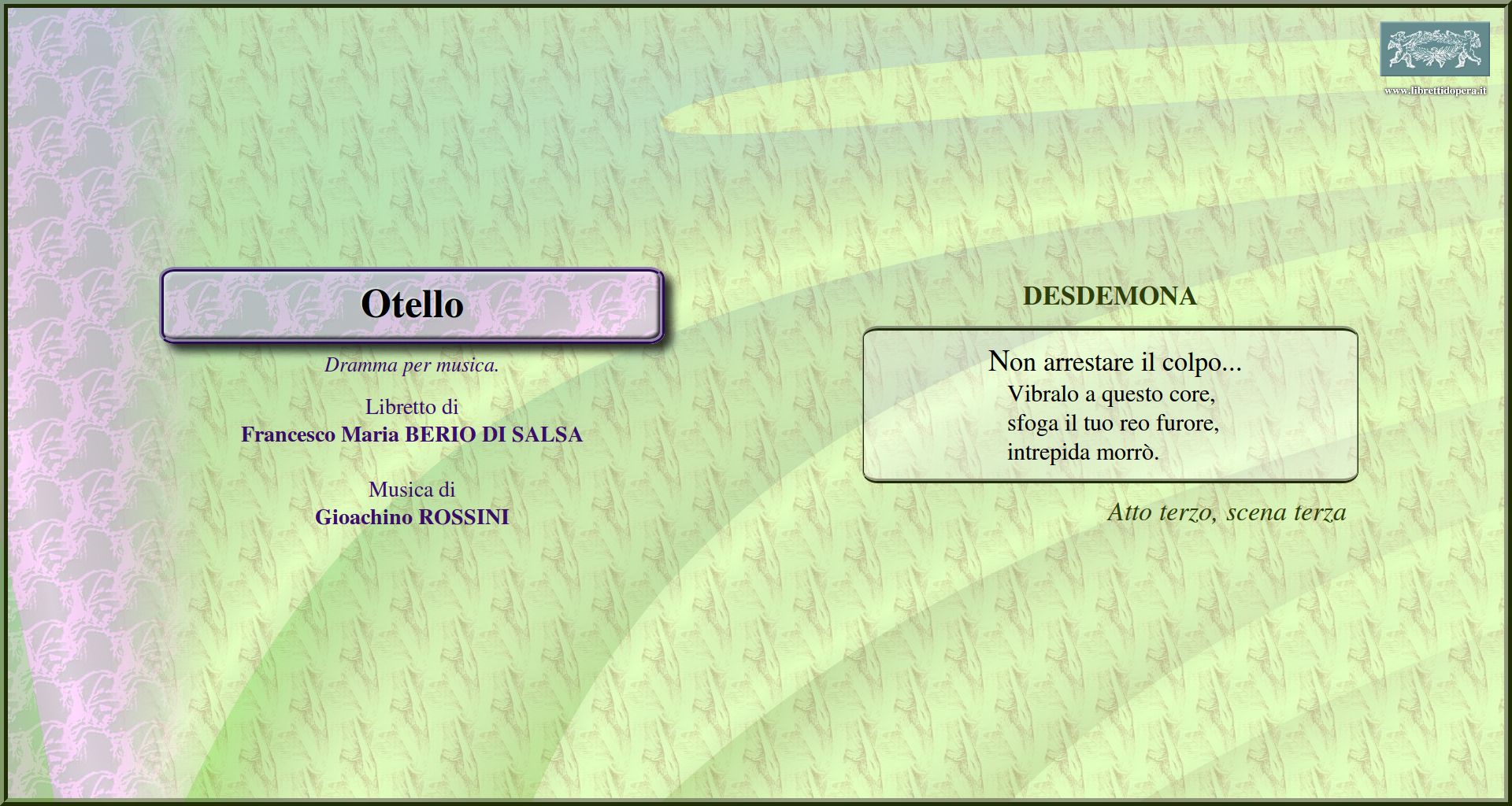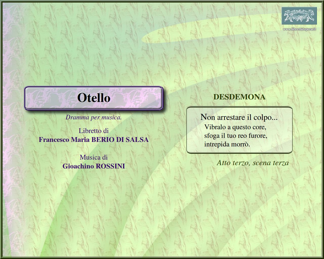 Ah sì, per voi già sento Incerta l'anima Ah vieni, nel tuo sangue Che smania! ahimè! che affanno? Assisa a' piè d'un salice Non arrestare il colpo