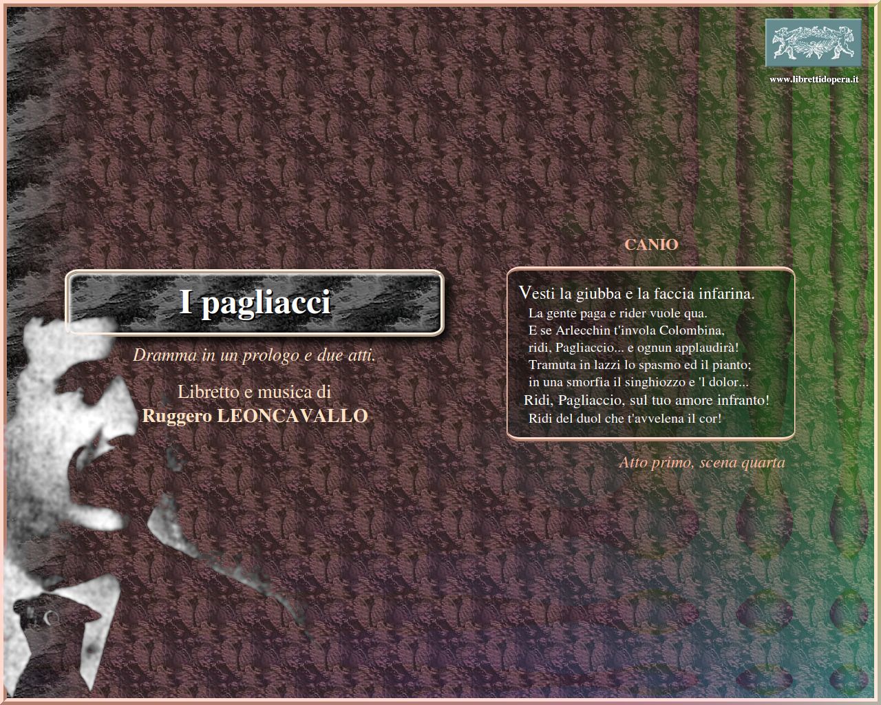Si può?... Signore! Signori!... Scusatemi Un tal gioco, credetemi, è meglio non giocarlo Un grande spettacolo Vesti la giubba e la faccia infarina La commedia è finita! No! Pagliaccio non son! Se il viso è pallido