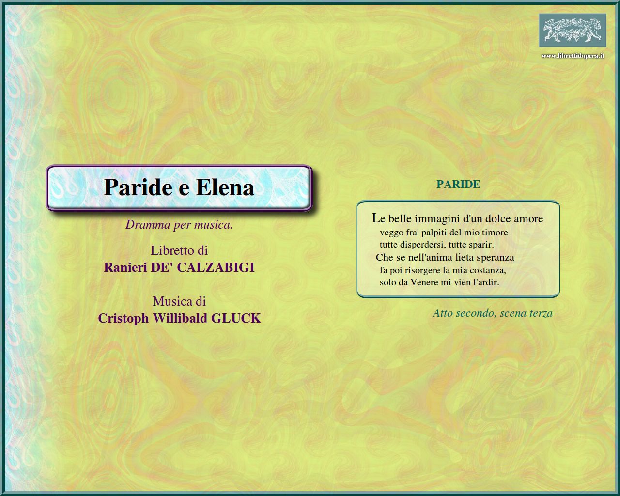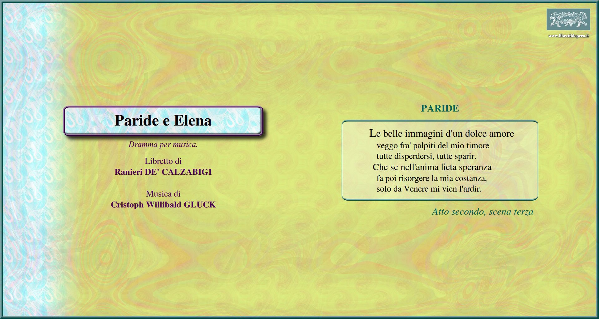 Oh del mio dolce ardor bramato oggetto! Le belle imagini d'un dolce amore Quegli occhi belli Lo potrò! Ma frattanto, oh infelice! Presto fugge la beltà