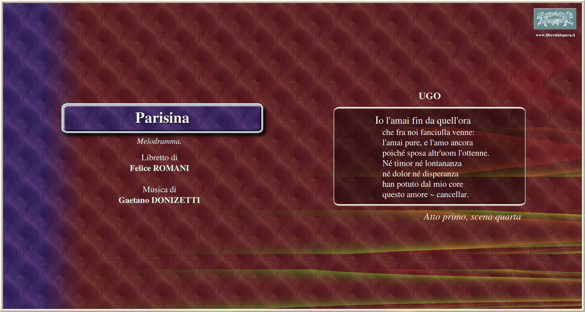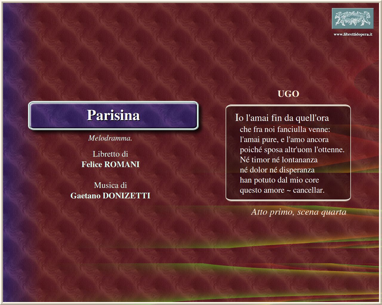 Io l'amai fin da quell'ora Forse un destin che intendere Sogno talor di correre Io sentii tremar la mano Ugo!... È spento! A me si renda