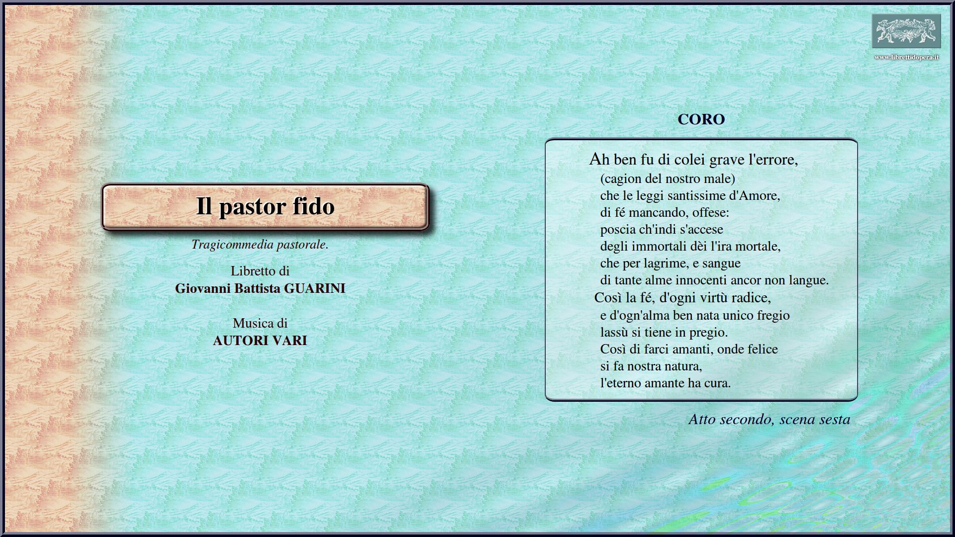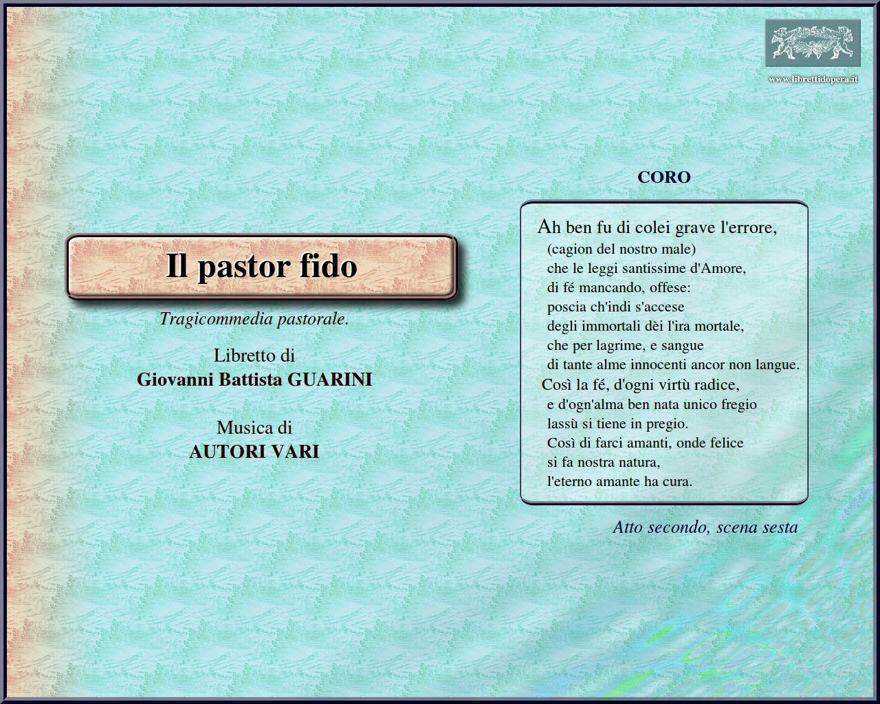 Come il gelo alle piante, ai fior l'arsura Ah ben fu di colei grave l'errore Come se' grande, Amore Oh bella età dell'oro Oh fortunata coppia