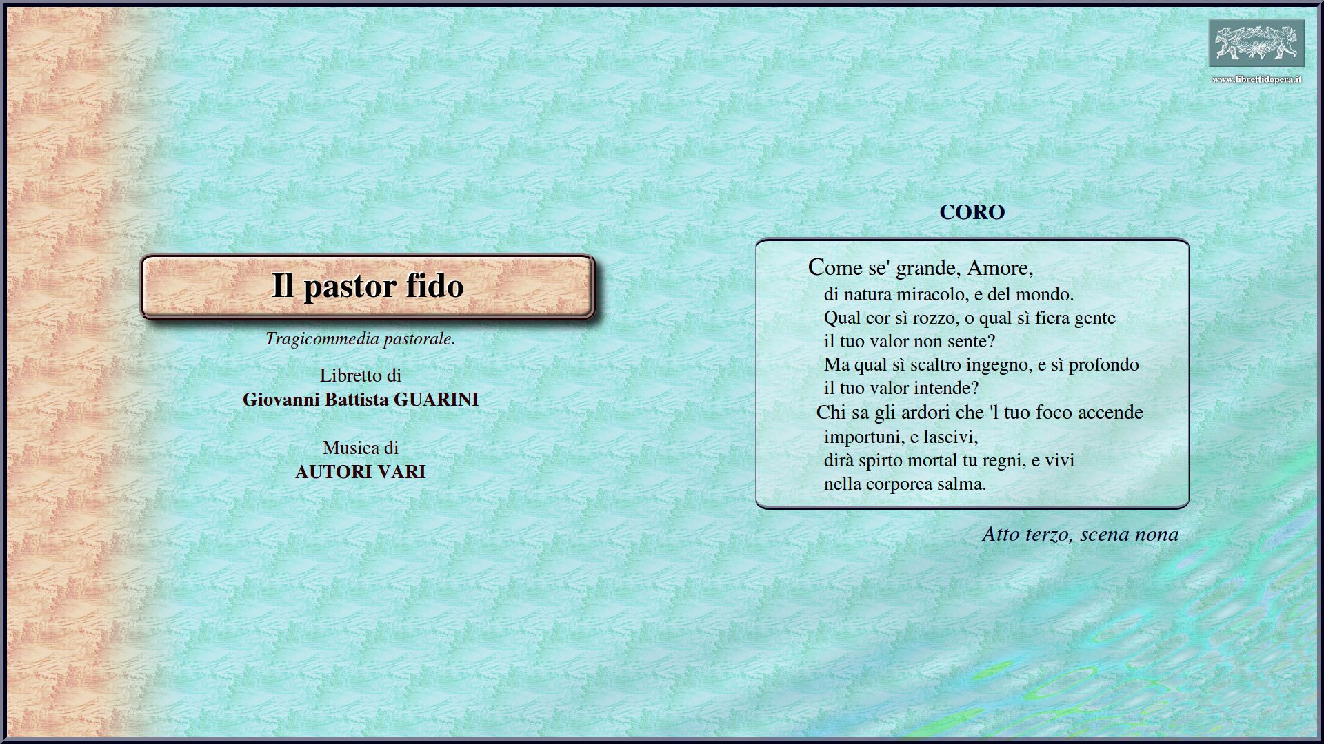 Come il gelo alle piante, ai fior l'arsura Ah ben fu di colei grave l'errore Come se' grande, Amore Oh bella età dell'oro Oh fortunata coppia