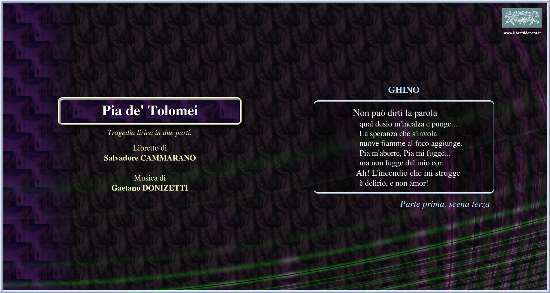 Non può dirti la parola Mi volesti sventurato? O tu che desti il fulmine Di pura gioia in estasi Seppi nel cor trafondergli Parea celeste spirito Il mugghiar di sì fera procella Lei perduta, in core ascondo Dio pietoso, un cor ti parla