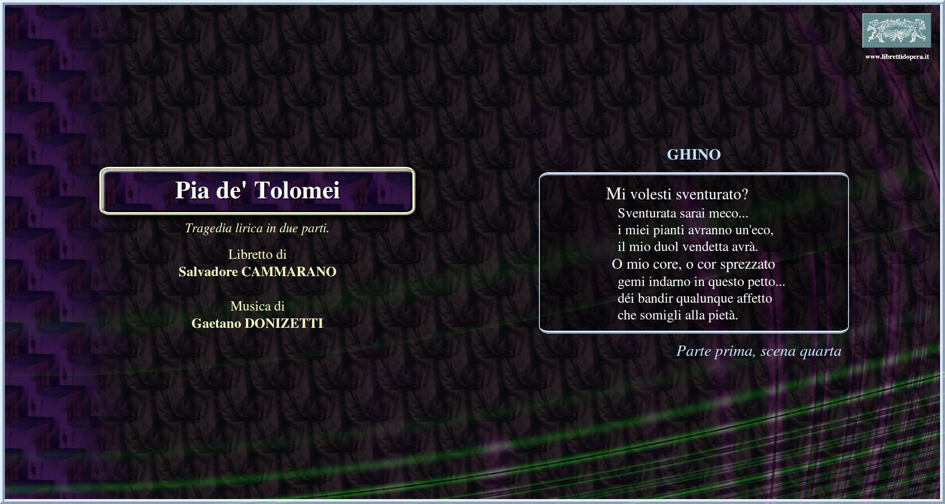 Non può dirti la parola Mi volesti sventurato? O tu che desti il fulmine Di pura gioia in estasi Seppi nel cor trafondergli Parea celeste spirito Il mugghiar di sì fera procella Lei perduta, in core ascondo Dio pietoso, un cor ti parla