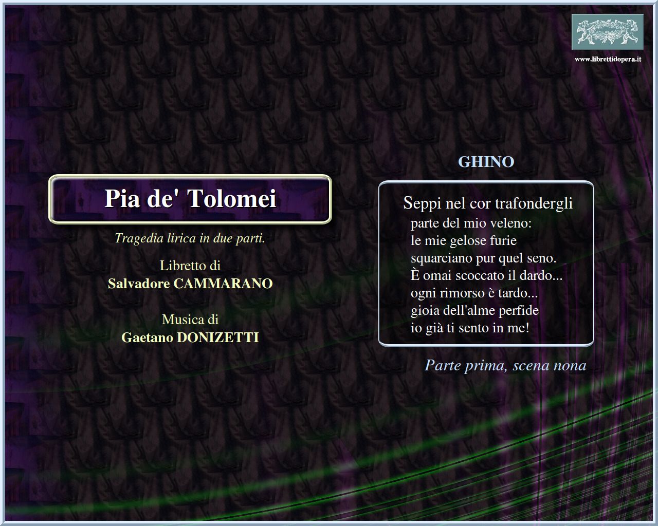 Non può dirti la parola Mi volesti sventurato? O tu che desti il fulmine Di pura gioia in estasi Seppi nel cor trafondergli Parea celeste spirito Il mugghiar di sì fera procella Lei perduta, in core ascondo Dio pietoso, un cor ti parla