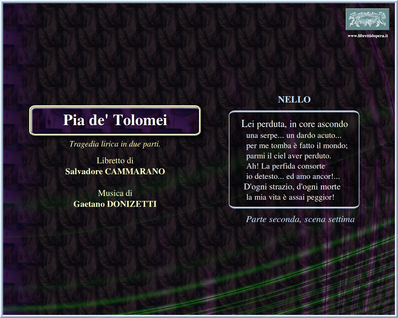 Non può dirti la parola Mi volesti sventurato? O tu che desti il fulmine Di pura gioia in estasi Seppi nel cor trafondergli Parea celeste spirito Il mugghiar di sì fera procella Lei perduta, in core ascondo Dio pietoso, un cor ti parla