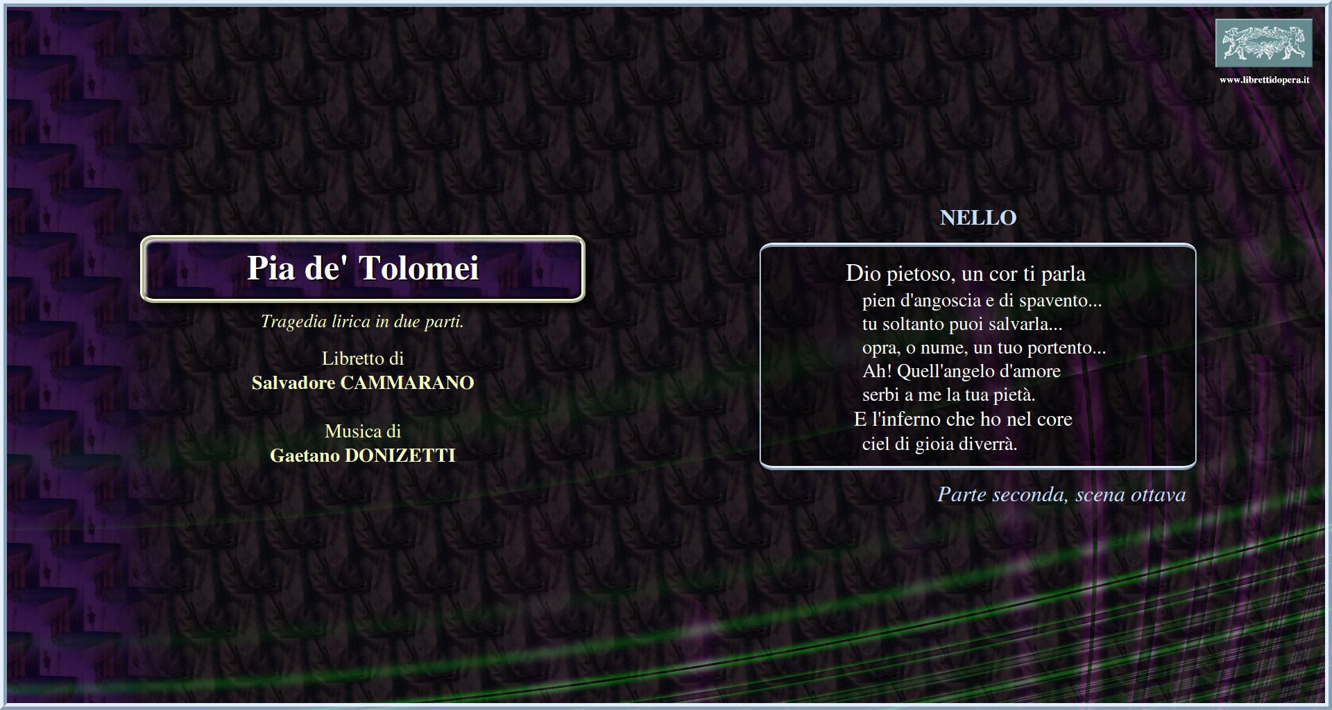 Non può dirti la parola Mi volesti sventurato? O tu che desti il fulmine Di pura gioia in estasi Seppi nel cor trafondergli Parea celeste spirito Il mugghiar di sì fera procella Lei perduta, in core ascondo Dio pietoso, un cor ti parla