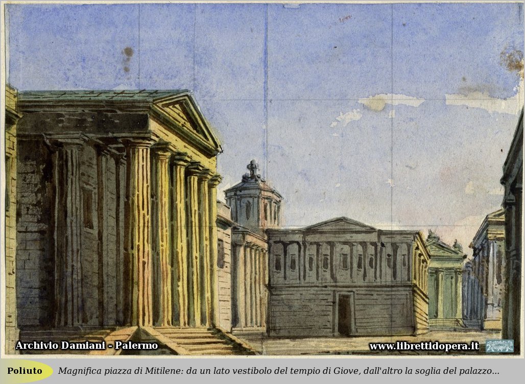 Scena sesta Magnifica piazza di Melitene: da un lato vestibolo del tempio di Giove, dall'altro la soglia del palazzo municipale.
