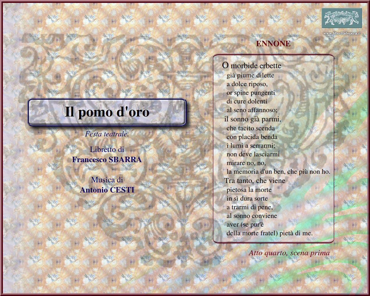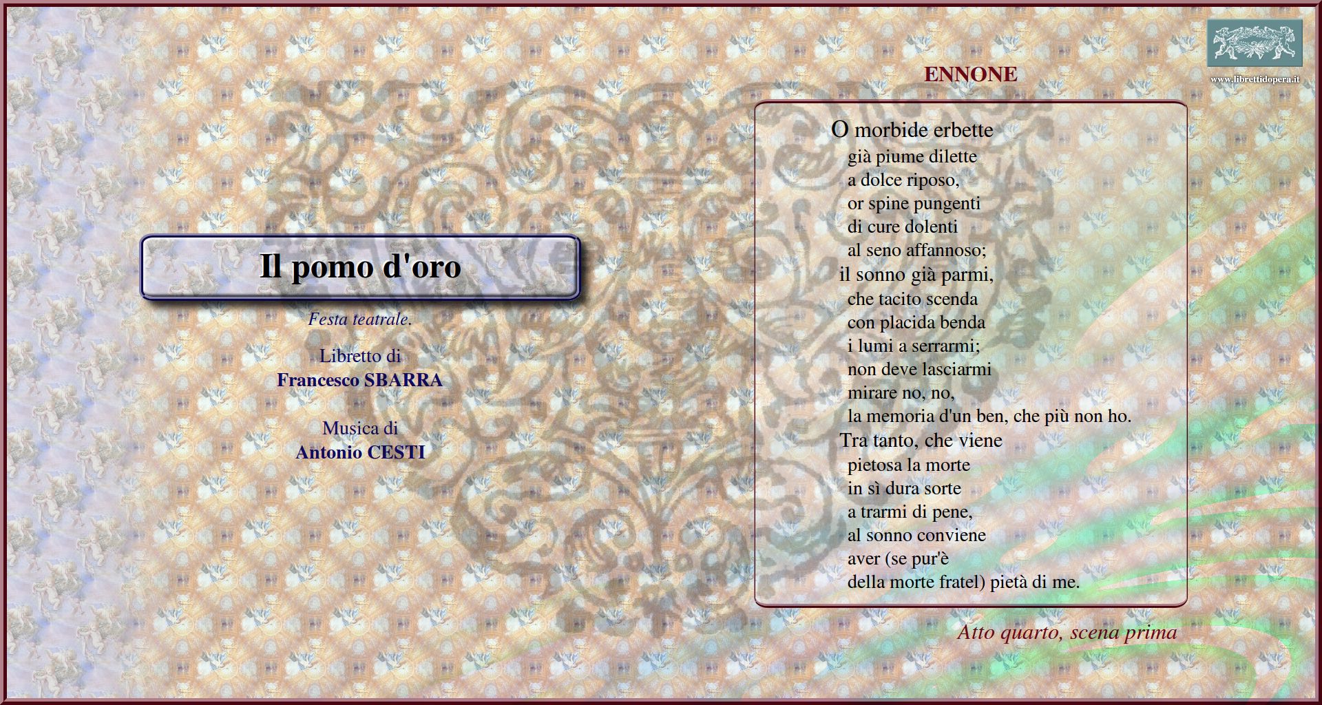 Di feste, e di giubili E dove t'aggiri Questo Marte ora, ch'è a cena O del ben, che acquisterò O mio caro io sono offesa Io spesi il mio fiato O morbide erbette S'a te sacre fra le dive Imparate in avvenire