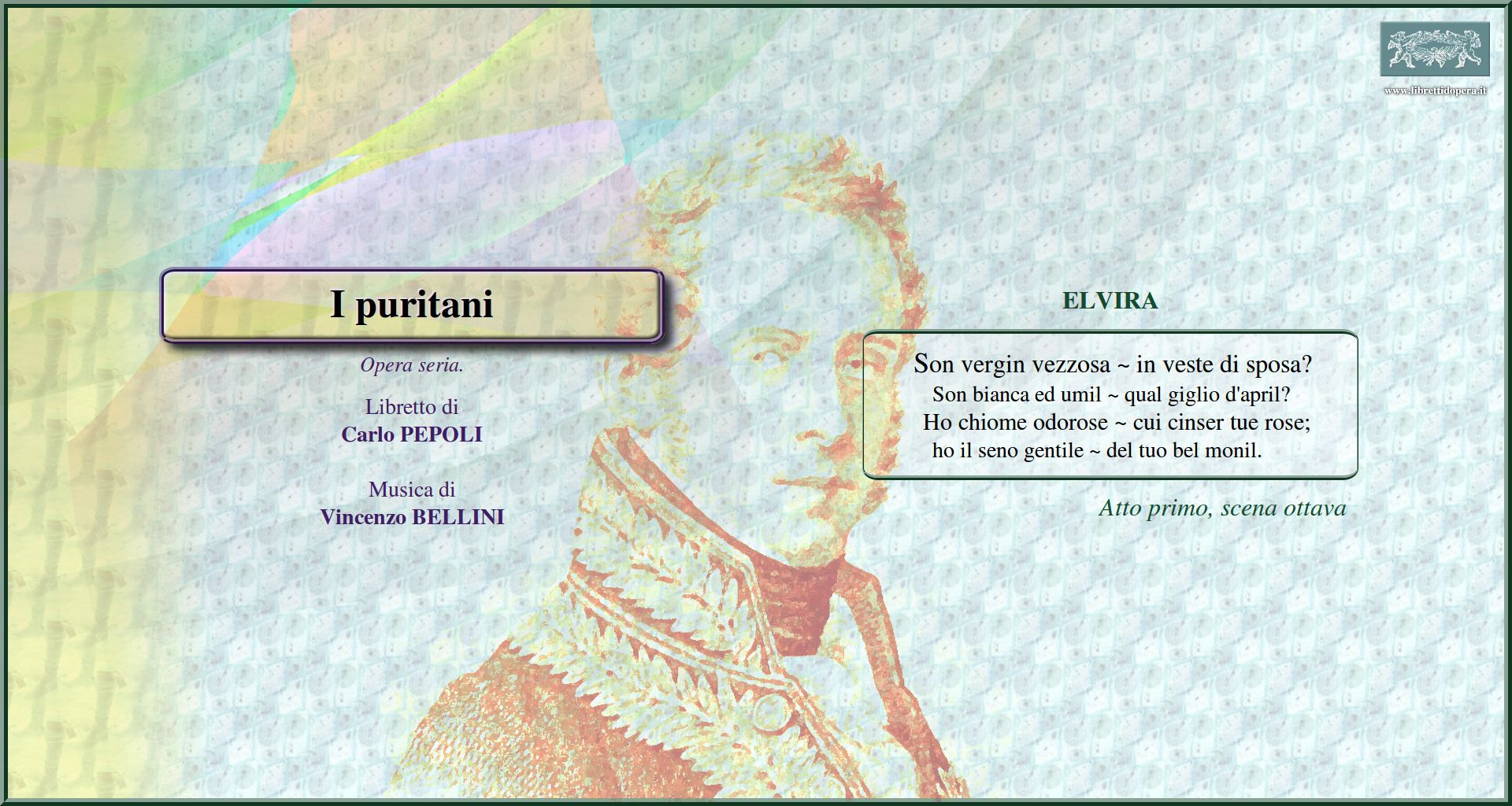 Ah per sempre io ti perdei A te, o cara, amor talora Son vergin vezzosa, in veste di sposa? Cinta di rose e col bel crin disciolto Qui la voce sua soave A una fonte afflitto e solo